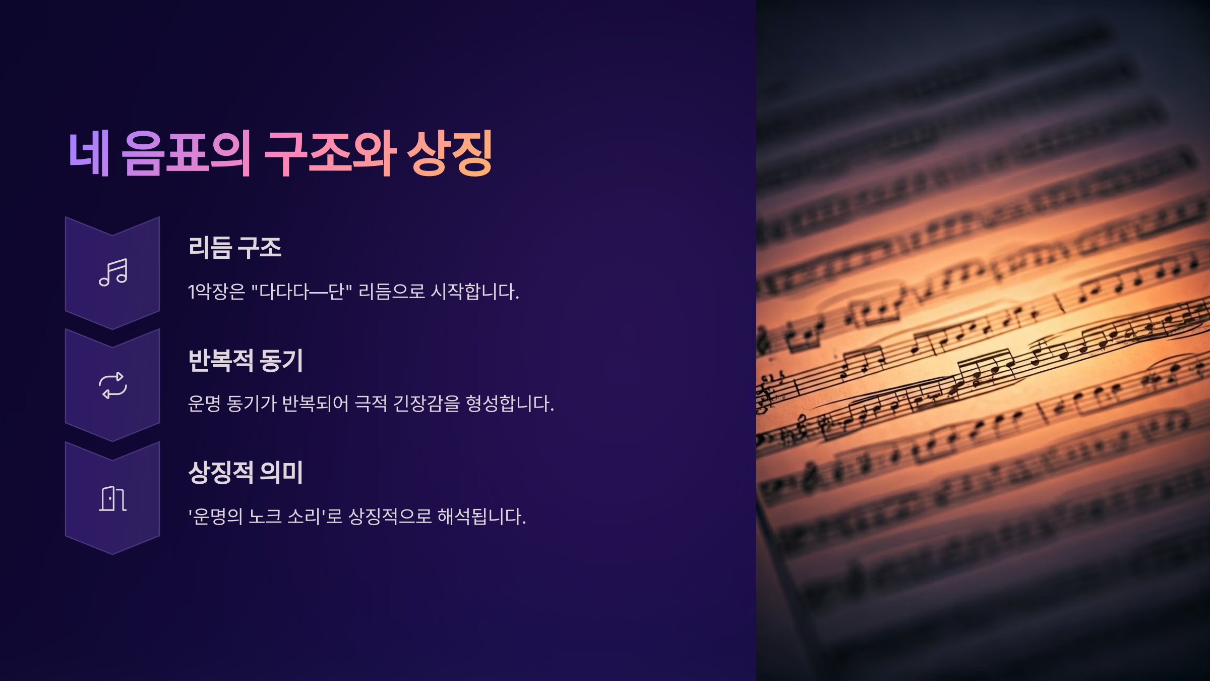 ‘운명’ 교향곡의 가장 상징적인 부분은 바로 첫 네 음표예요. “빠-빠-빠-빰”이라는 이 리듬은 단순하지만, 굉장히 강한 인상을 남기죠. 이 네 음은 '단축된 운명의 노크'라고도 불리며, 그 힘과 긴장감은 청중을 사로잡는 데에 충분해요.