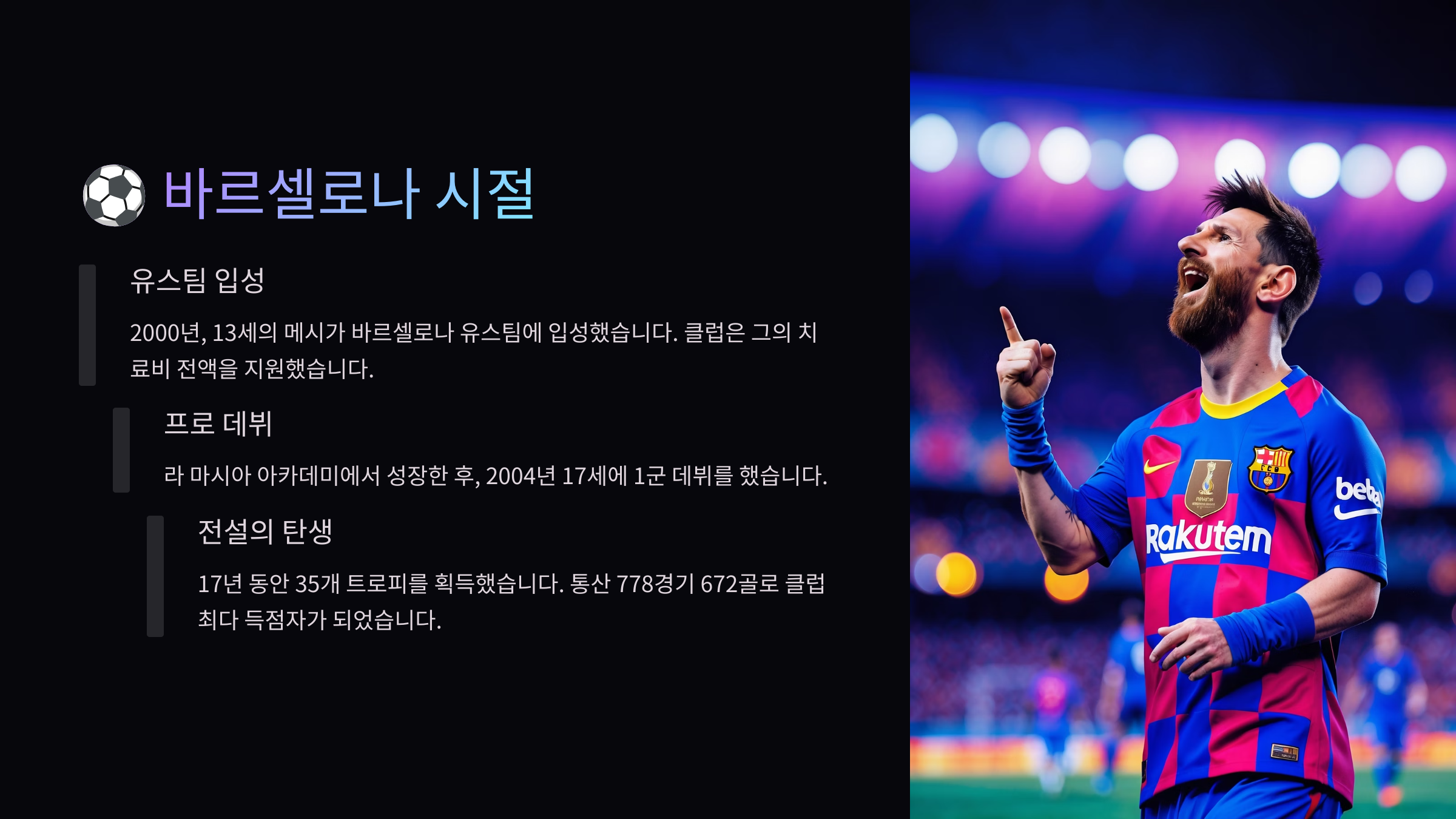 👟 메시는 매일같이 훈련에 몰두했어요. 그의 태도와 집중력은 또래 친구들과는 차원이 달랐죠. 바르셀로나의 라 마시아 유스 아카데미에 입단한 뒤로, 메시의 기량은 눈부시게 성장했답니다. 이곳에서 배운 기술과 전술이 훗날 그를 세계 최고의 선수로 만들어 줬어요. 이 모든 것은 어린 시절부터 다져온 메시의 꿈과 열정 덕분이에요.