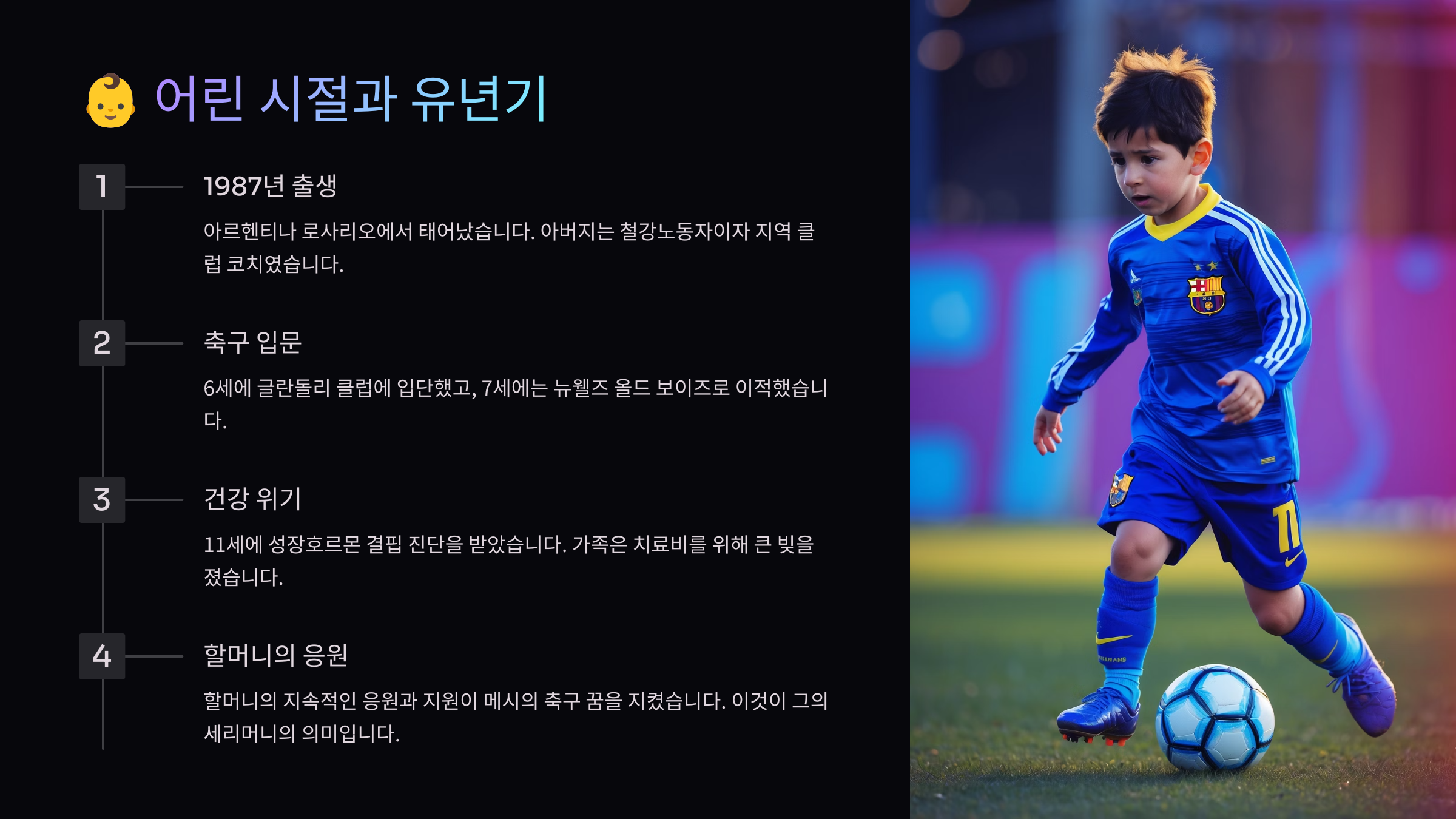 리오넬 메시는 아르헨티나 로사리오에서 태어났어요. 그의 가족은 중산층이었고, 어릴 때부터 축구를 사랑했답니다. 그의 아버지 호르헤 메시가 축구 코치였고, 어머니는 공장에서 일했어요. 어린 메시가 공을 다루는 모습은 이미 다른 아이들과 달랐다고 해요.