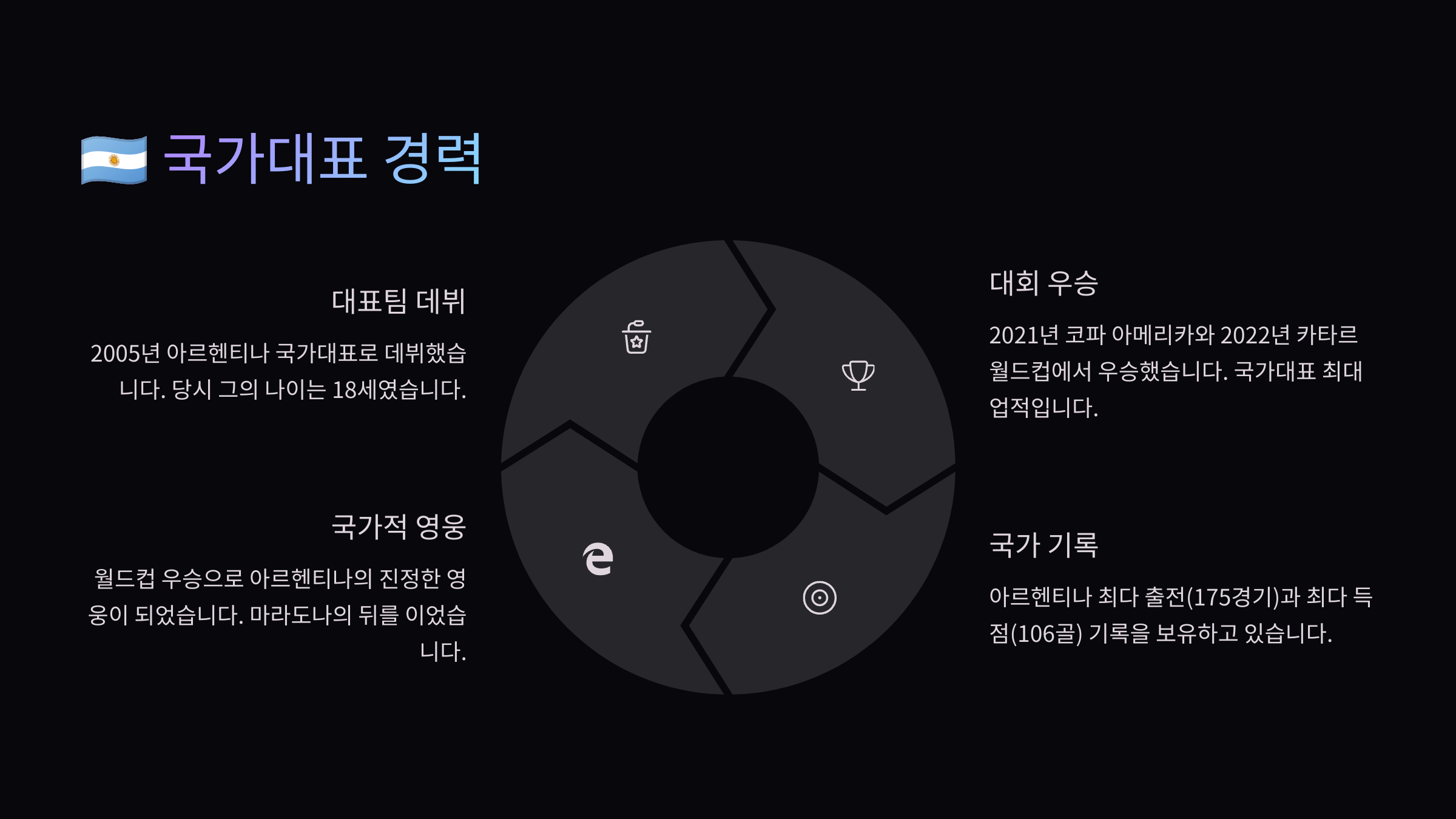 메시는 이제 아르헨티나 대표팀에서 모든 것을 이뤄낸 선수로 기억돼요. 수많은 골과 어시스트, 그리고 무엇보다 팀에 대한 끝없는 헌신이 메시를 ‘전설’로 만들어줬답니다. 그가 보여준 승부욕과 리더십은 많은 축구 팬들에게 영원히 남을 거예요.
