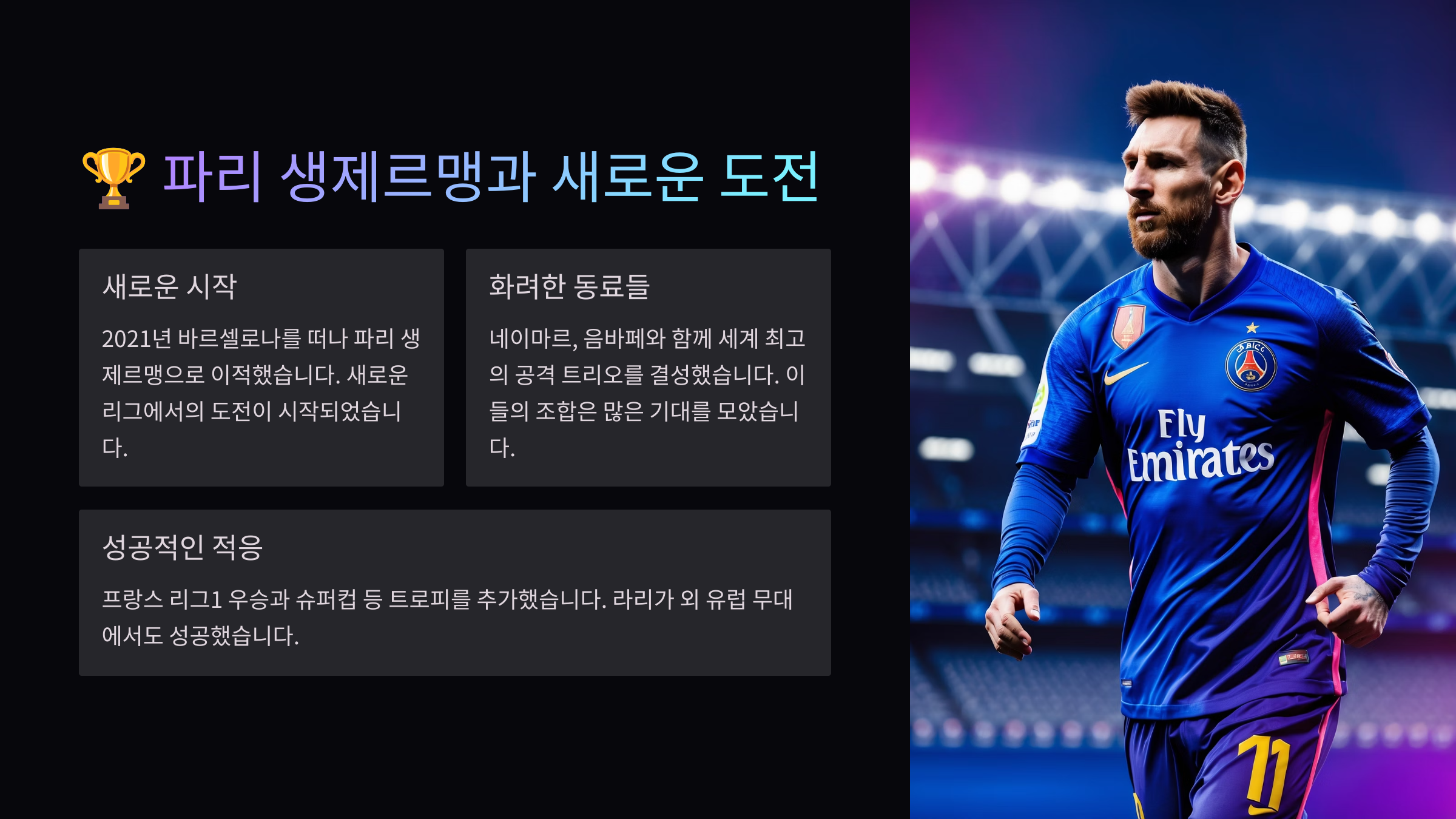 PSG에서의 메시 첫 시즌은 적응의 시간이었어요. 새로운 리그, 새로운 동료들과의 호흡을 맞추는 것은 쉽지 않았죠. 하지만 메시는 천천히 자신만의 플레이 스타일을 되찾기 시작했어요. 킬리안 음바페, 네이마르와 함께 ‘드림 트리오’를 형성하며 상대 수비진을 흔들었답니다. 비록 처음에는 어려움이 있었지만, 그의 축구 센스는 여전히 빛났어요.