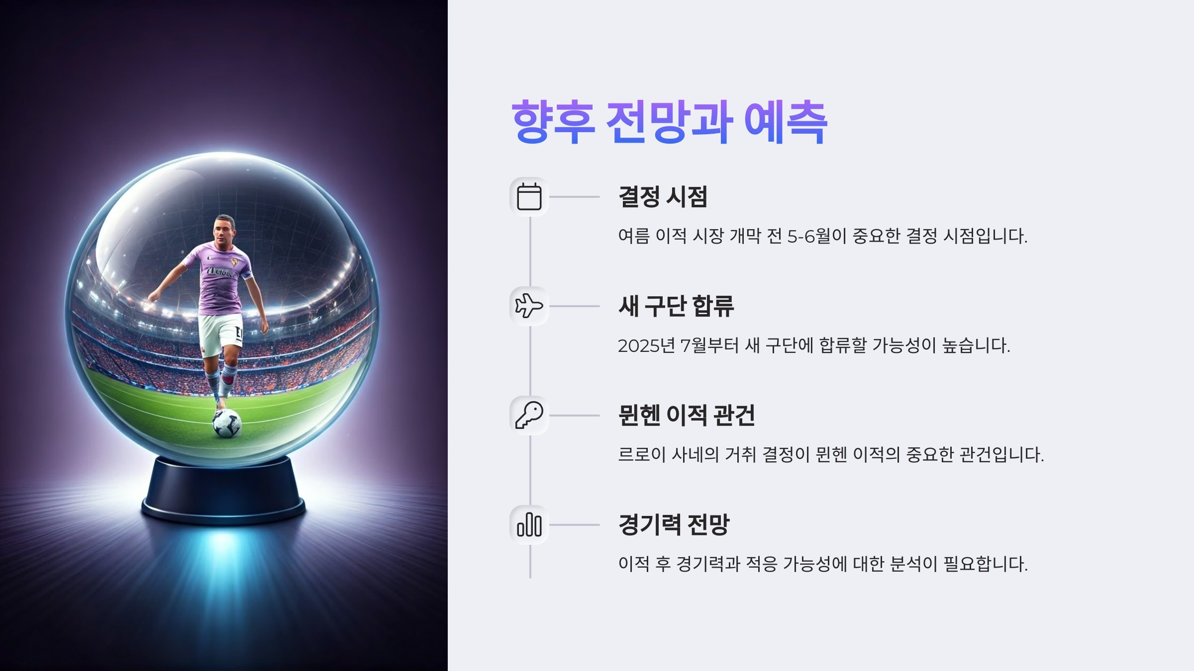 이적 여부는 유로 2025 대회 이후로 미뤄질 가능성도 있어요. 구단들도 손흥민의 상태와 대표팀 경기력을 지켜보며 최종 제안을 조율하고 있답니다.