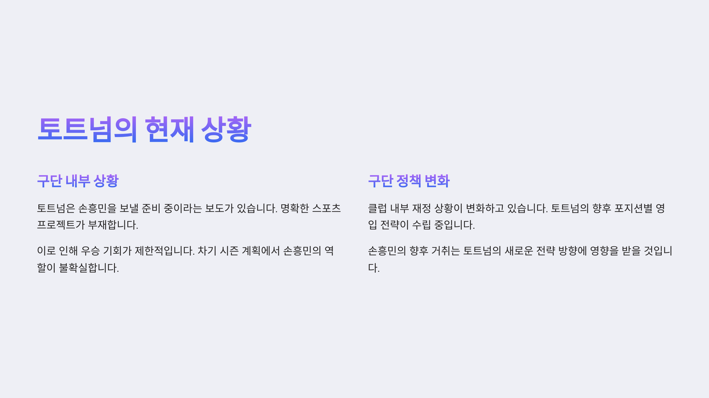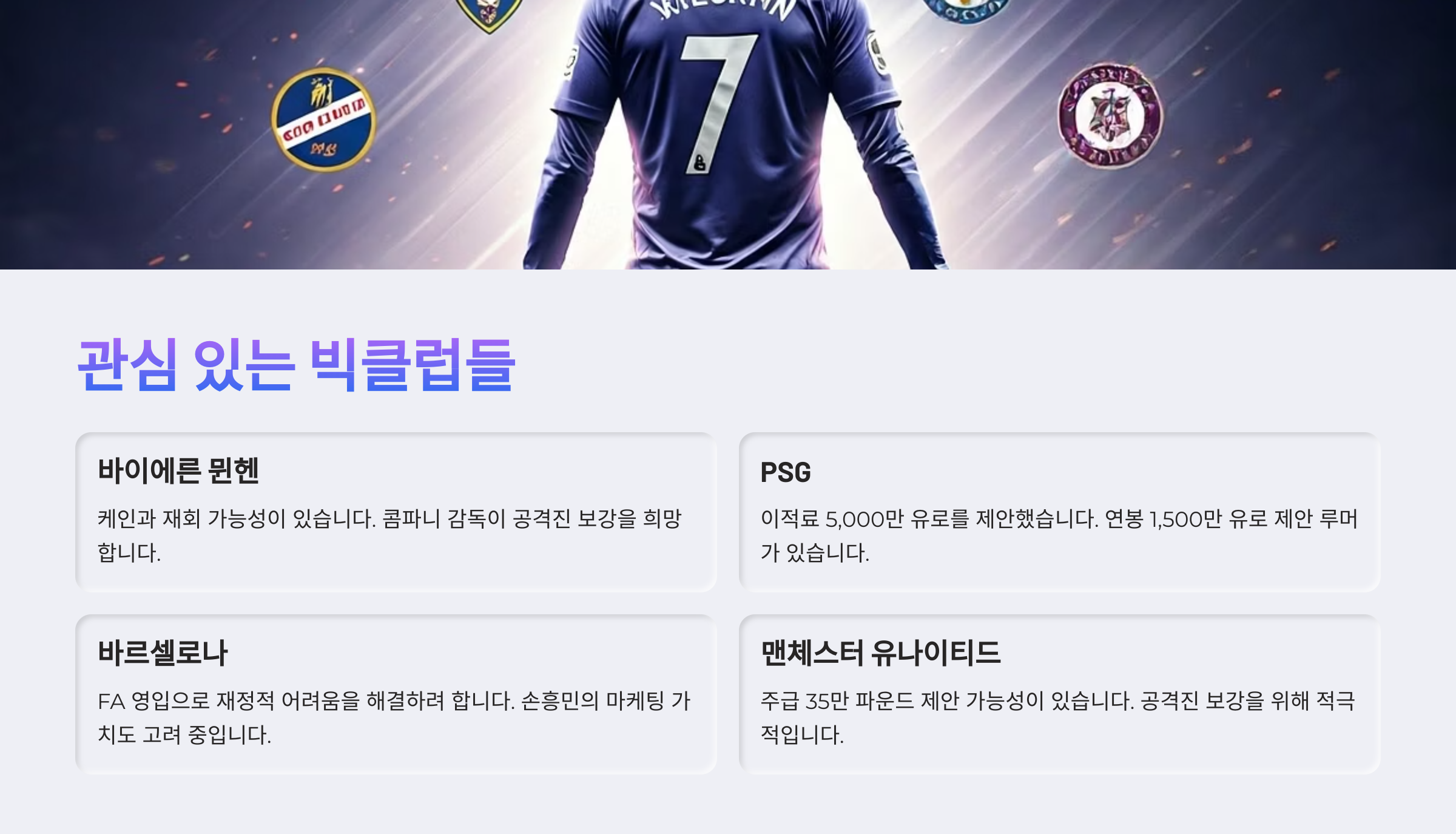 팬들 사이에서도 "이제는 우승을 위해 떠나야 한다"는 목소리가 커지고 있어요. 물론 토트넘 측은 손흥민의 잔류를 원하지만, 설득할 수 있는 보강이나 비전 제시가 부족한 상태랍니다.