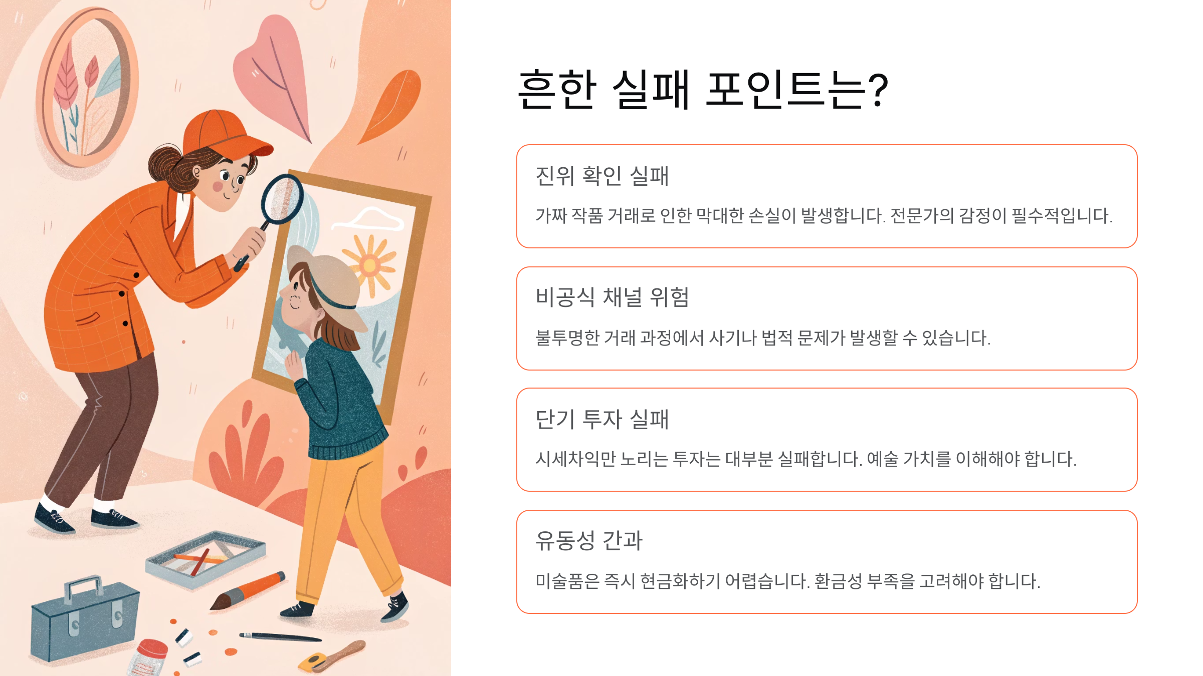 예술품 투자도 다른 투자처럼 실패할 수 있어요. 가장 흔한 실패는 ‘감정에 치우친 결정’이에요. 그림이 예쁘다고 혹해서 큰돈을 들이거나, 작가의 화려한 외모나 인스타 팔로워 수만 보고 선택하는 경우도 많아요. 미술 시장은 철저히 냉정한 자본주의의 일부랍니다.