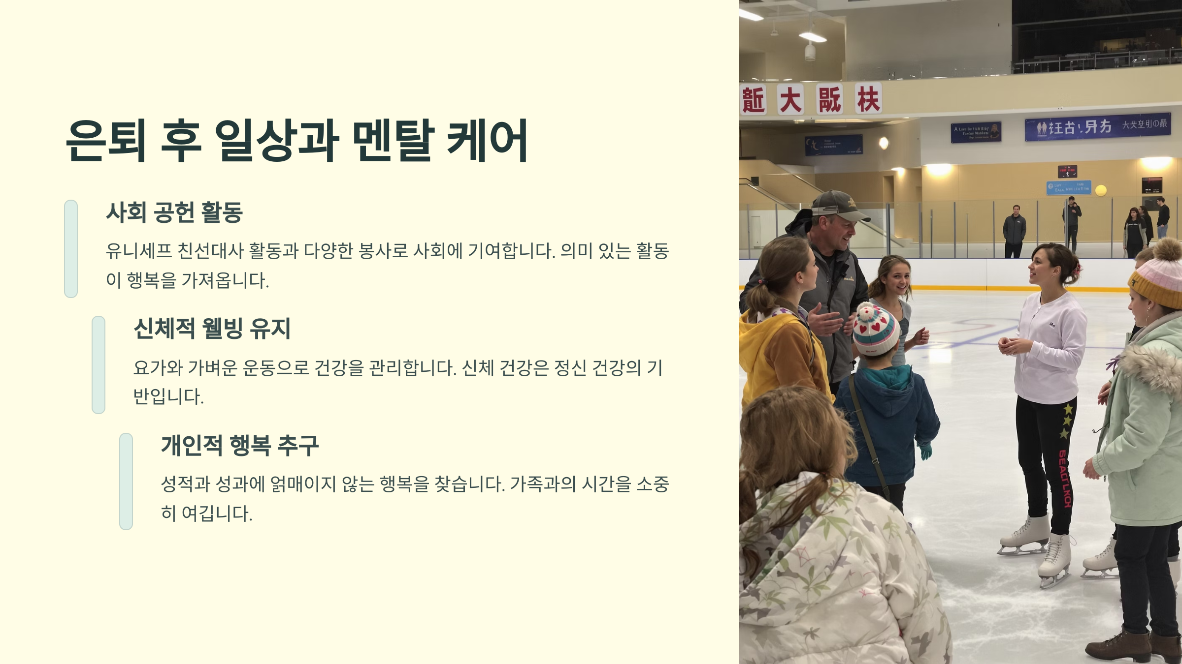 은퇴 후에도 김연아는 자기 삶의 리듬을 유지하며 멘탈을 잘 관리하고 있어요. 강연, 광고, 사회활동 등 다양한 분야에서 활동하면서도 스스로에 대한 기준과 건강한 거리두기를 유지하죠.