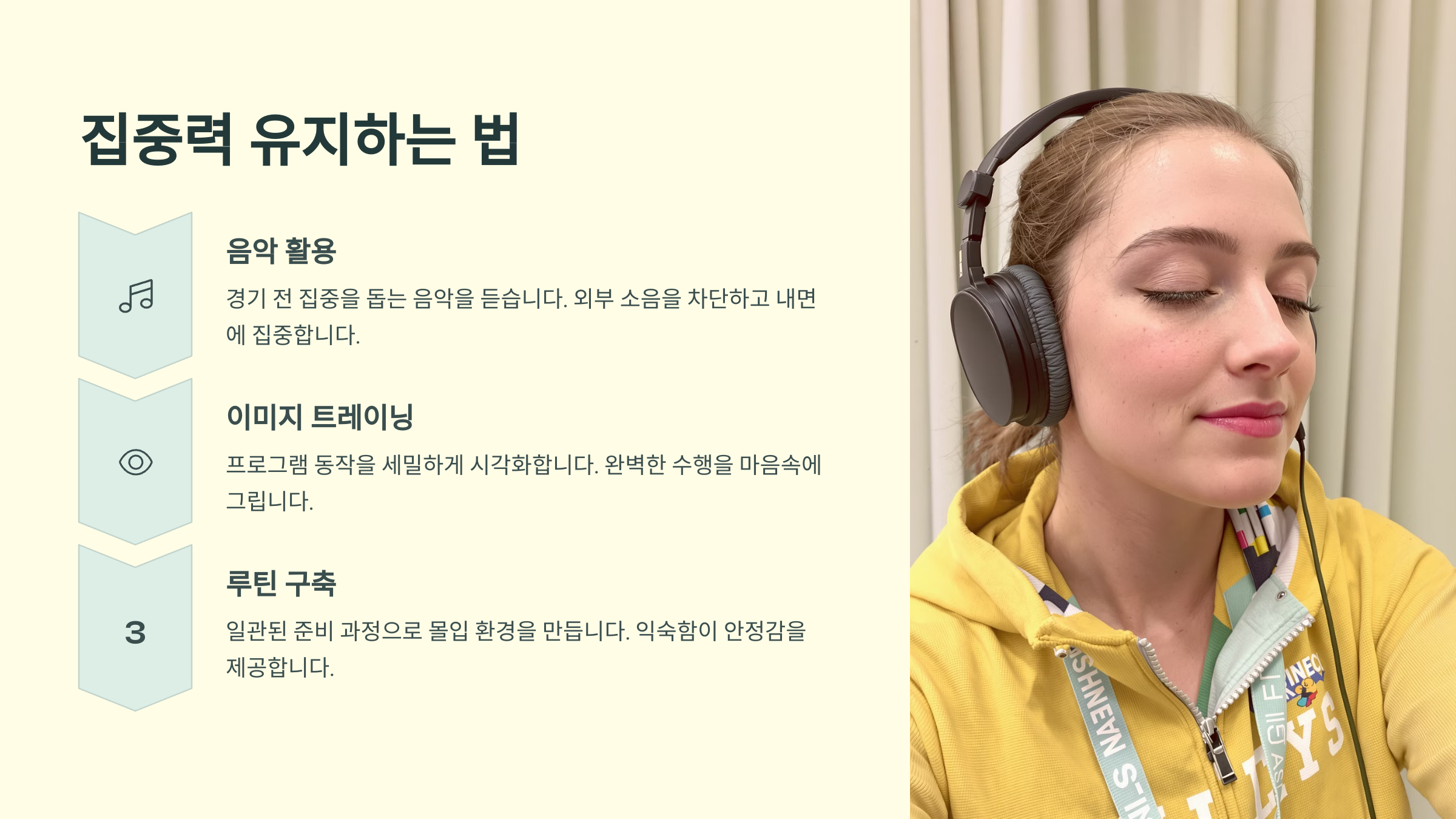 그녀는 하루 중 정해진 시간에 스케이트 훈련을 포함해 체력 훈련, 요가, 식단 관리까지 일관되게 유지했어요. 이렇게 규칙적인 생활은 외부 변수로부터 오는 스트레스를 최소화하고 자기 자신을 컨트롤할 수 있게 도와줘요.