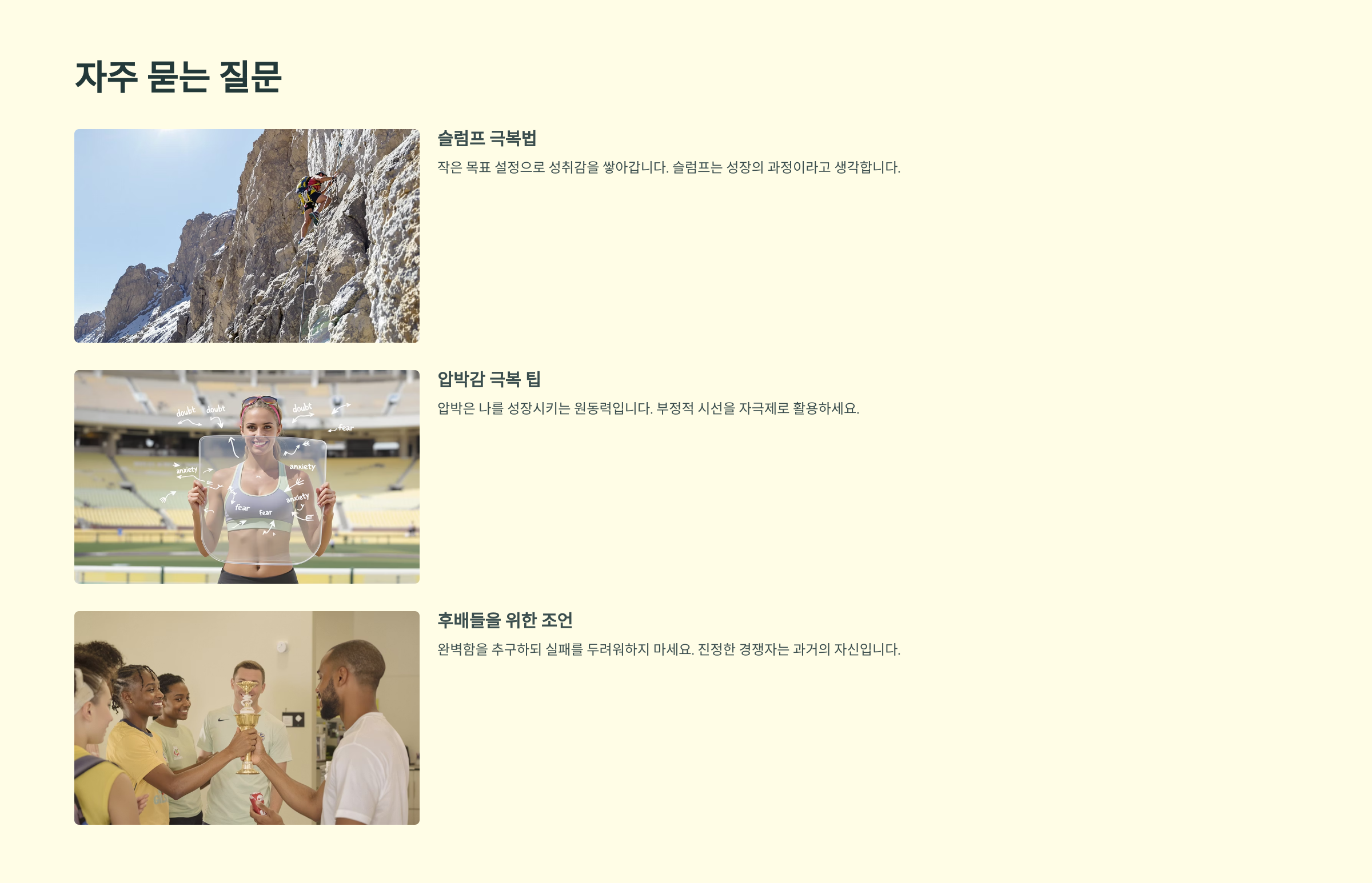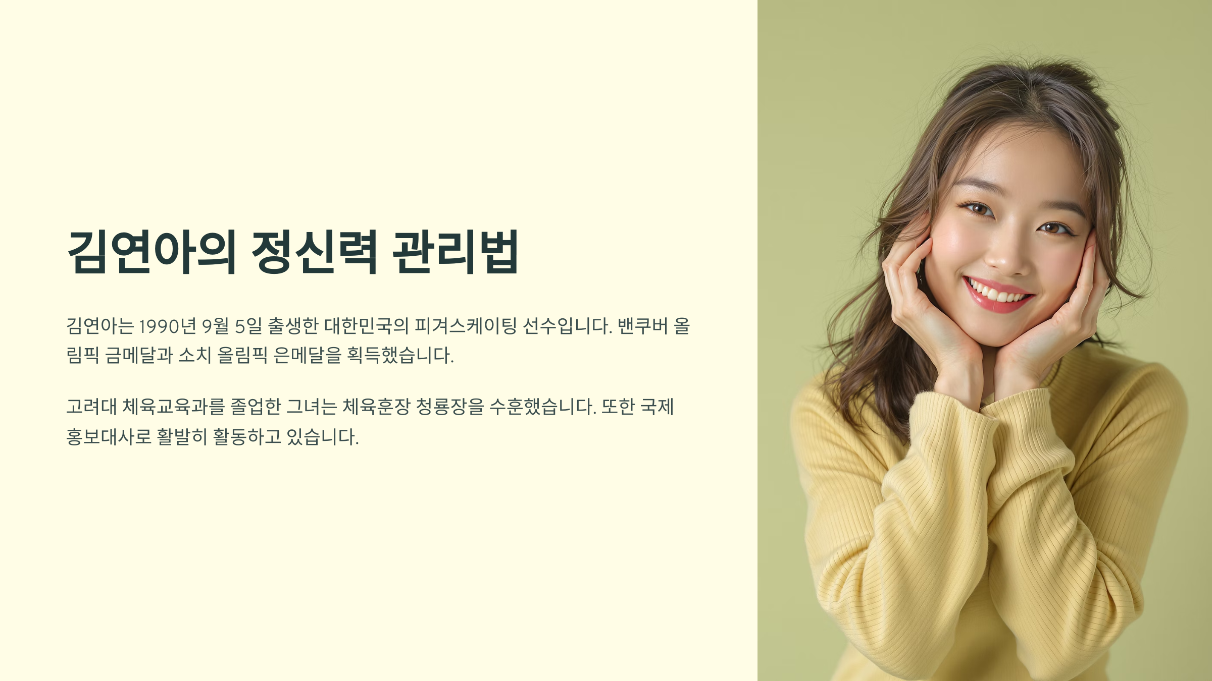 멘탈이 강한 사람은 위기를 없애는 사람이 아니라, 위기 속에서도 제 역할을 해내는 사람이에요. 김연아는 바로 그런 사람이었답니다. 👏