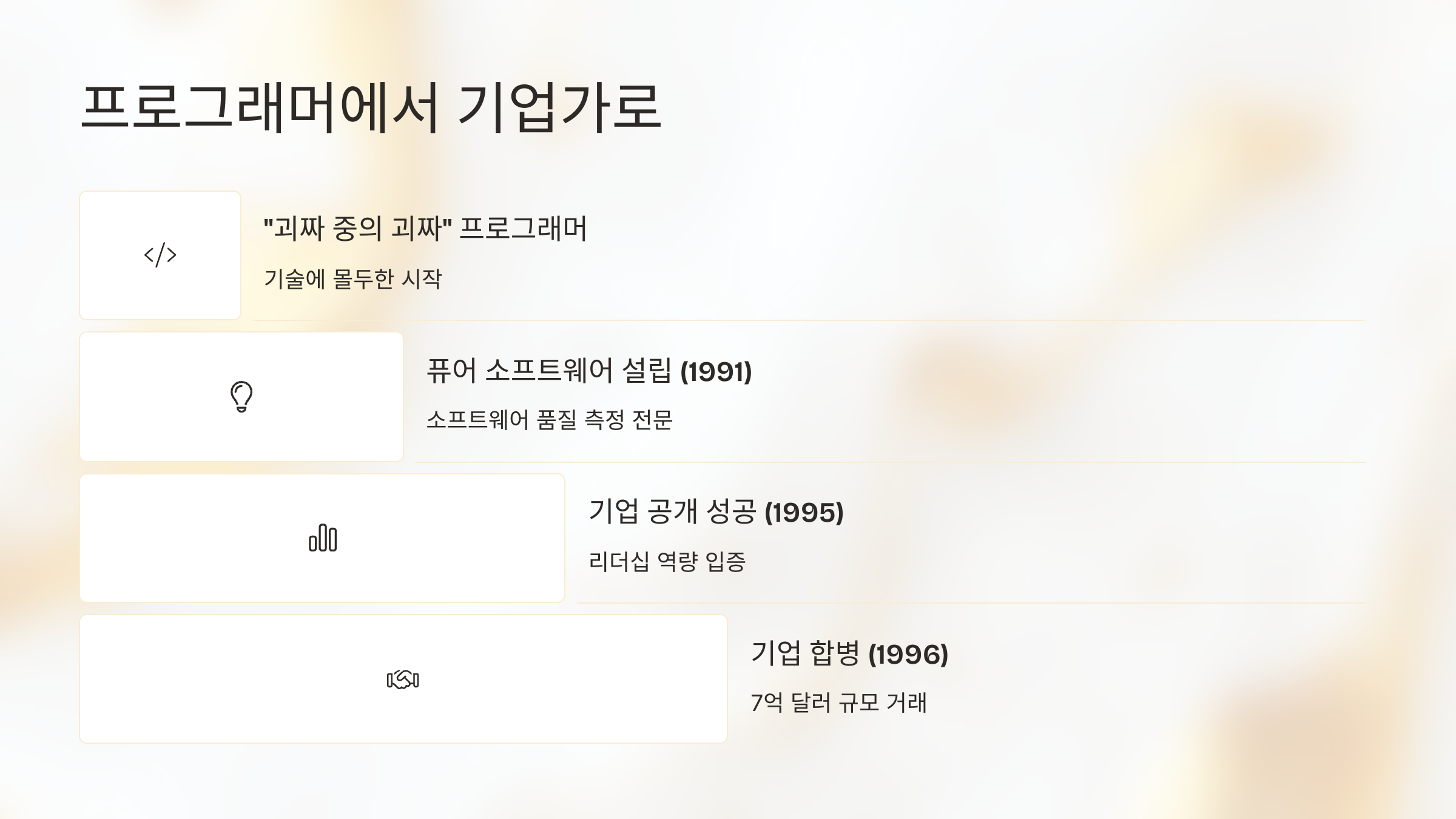 이후 그는 첫 번째 창업을 하게 돼요. 바로 ‘퓨어 소프트웨어(Pure Software)’라는 회사였죠. 이 회사는 복잡한 소프트웨어를 테스트하고 디버깅하는 툴을 개발했는데, 당시 소프트웨어 시장에서 상당히 혁신적인 접근이었어요. 그는 기술자이자 경영자로 빠르게 성장했고, 회사를 성공적으로 키워 1997년 거대 IT기업 'Rational Software'에 매각했답니다.