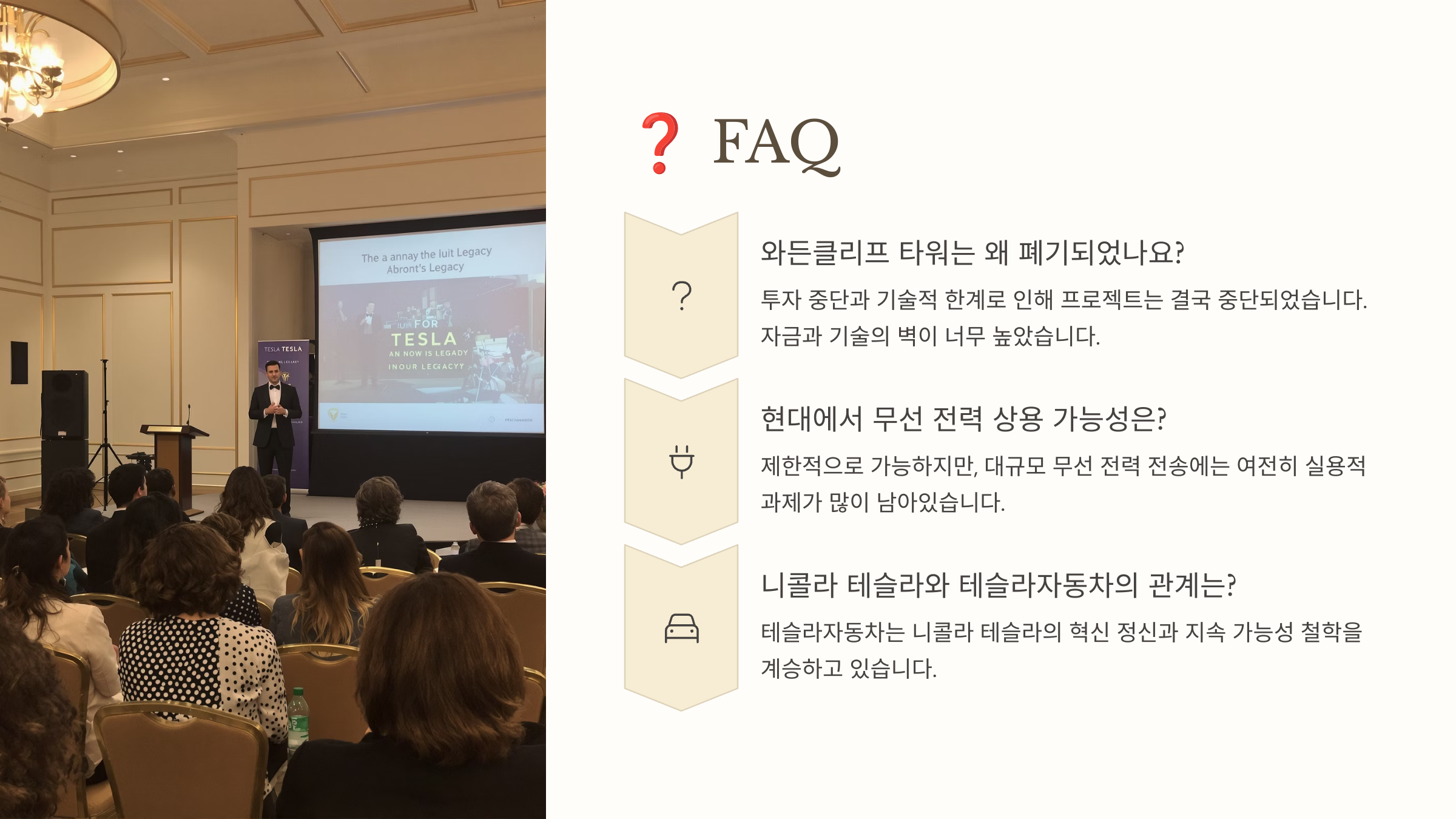 우리는 지금 그의 발명을 기반으로 다양한 기술을 누리고 있어요. 하지만 동시에 우리는 ‘이 기술이 누구를 위한 것인가?’라는 질문도 같이 던져야 해요. 테슬라는 이런 질문을 끊임없이 던졌던 사람이었어요. 그래서 그는 발명이 아닌 ‘메시지’를 남겼다고 생각해요.