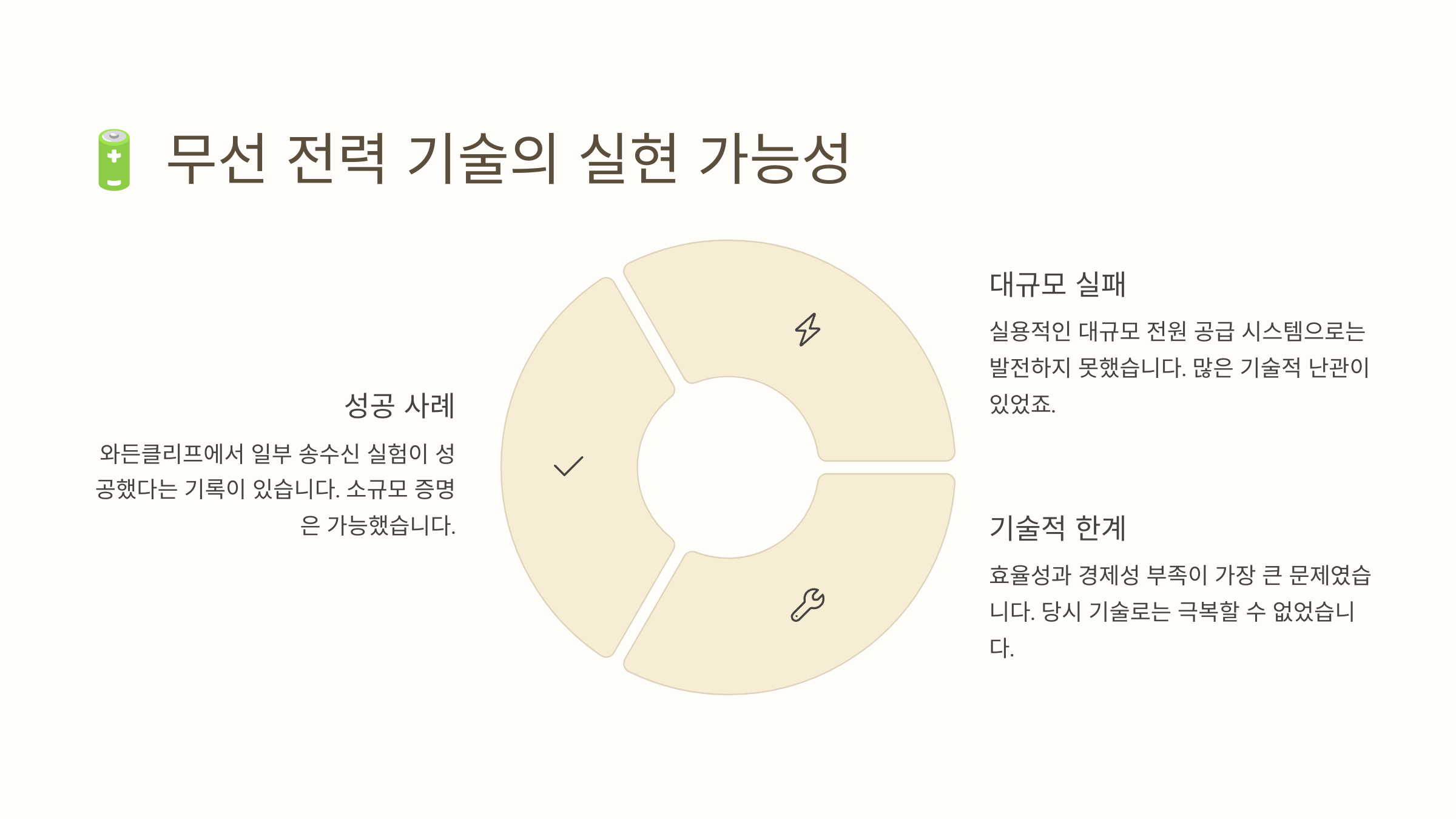 하지만 이 기술에는 치명적인 약점도 있었어요. 대기 중 고주파 전송은 매우 큰 에너지가 필요하고, 날씨나 지형, 대기 조건에 따라 전파 손실이 커질 수 있다는 점이었어요. 그리고 무엇보다 수신기를 설치하지 않으면 그 전기를 쓸 수 없다는 점도 기술 보급의 큰 장애였죠.