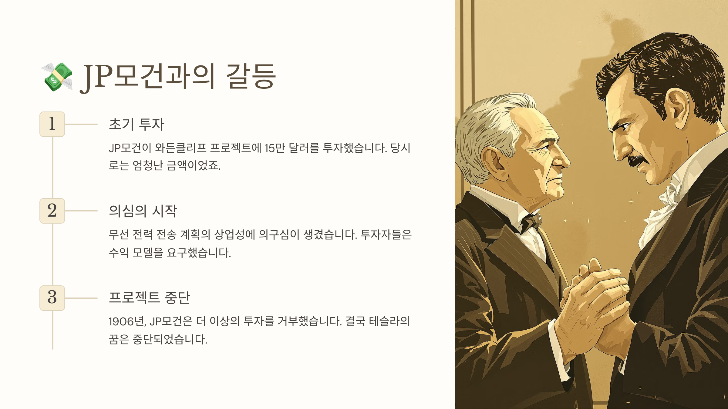 모건은 이 사실을 알고 충격을 받았어요. 당시 모건은 제너럴 일렉트릭, 웨스팅하우스, 벨 시스템 등 주요 전력 및 통신 기업들의 지분을 다수 보유하고 있었고, 전기 산업으로 막대한 수익을 올리고 있었거든요. 그런데 테슬라의 계획은 이 모든 비즈니스 모델을 무너뜨릴 가능성이 있었죠.