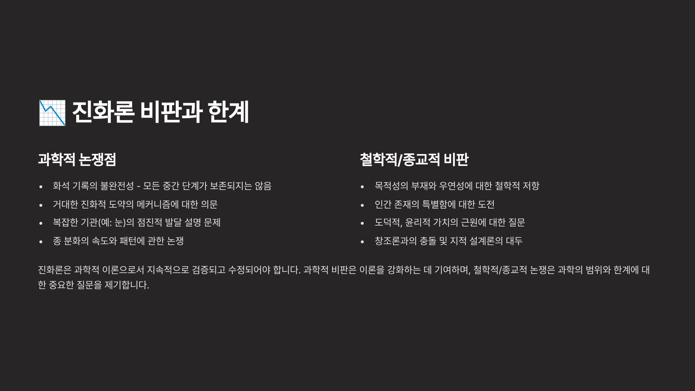 결국 진화론도 완벽한 이론은 아니지만, 계속해서 새로운 증거들과 기술로 보완되며 지금도 살아 움직이는 과학이론이에요. 비판은 오히려 이론을 단단하게 만들어 주는 자극제가 된 셈이에요. 📚