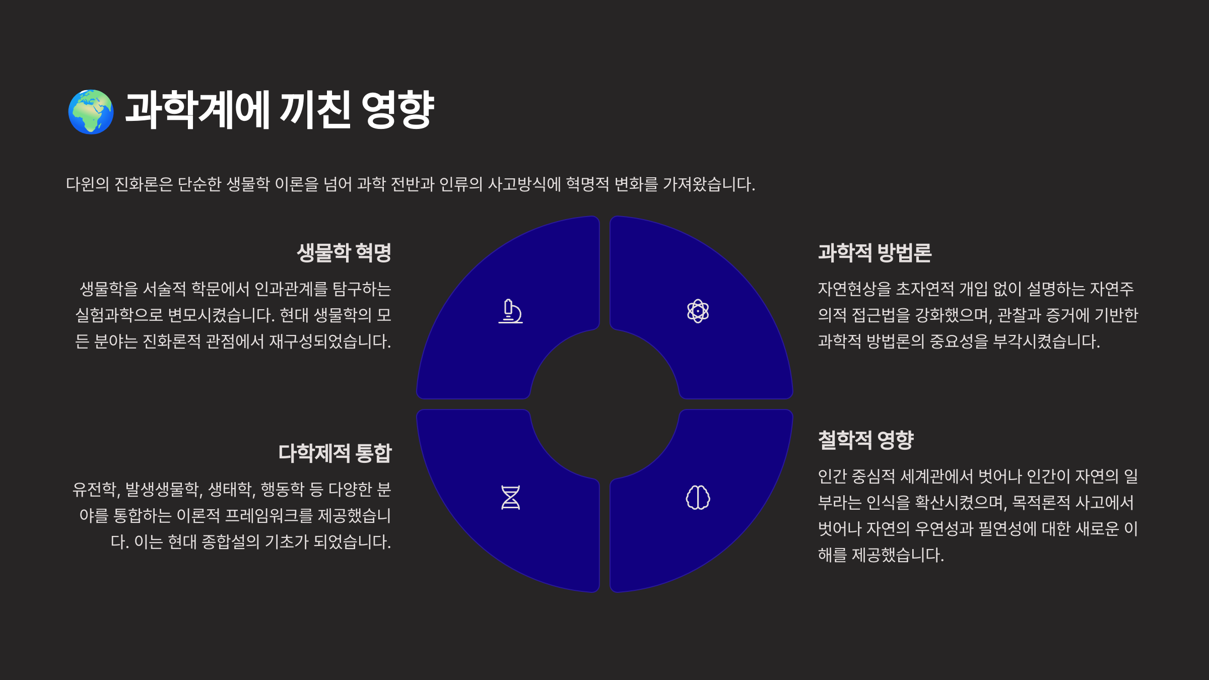 진화론은 과학자들에게 새로운 시각을 열어줬고, 생명체를 연구하는 방법까지 바꾸게 만들었어요. 그동안 인간 중심적이었던 자연관이 생명 중심적 사고로 확장된 거예요. 🍃