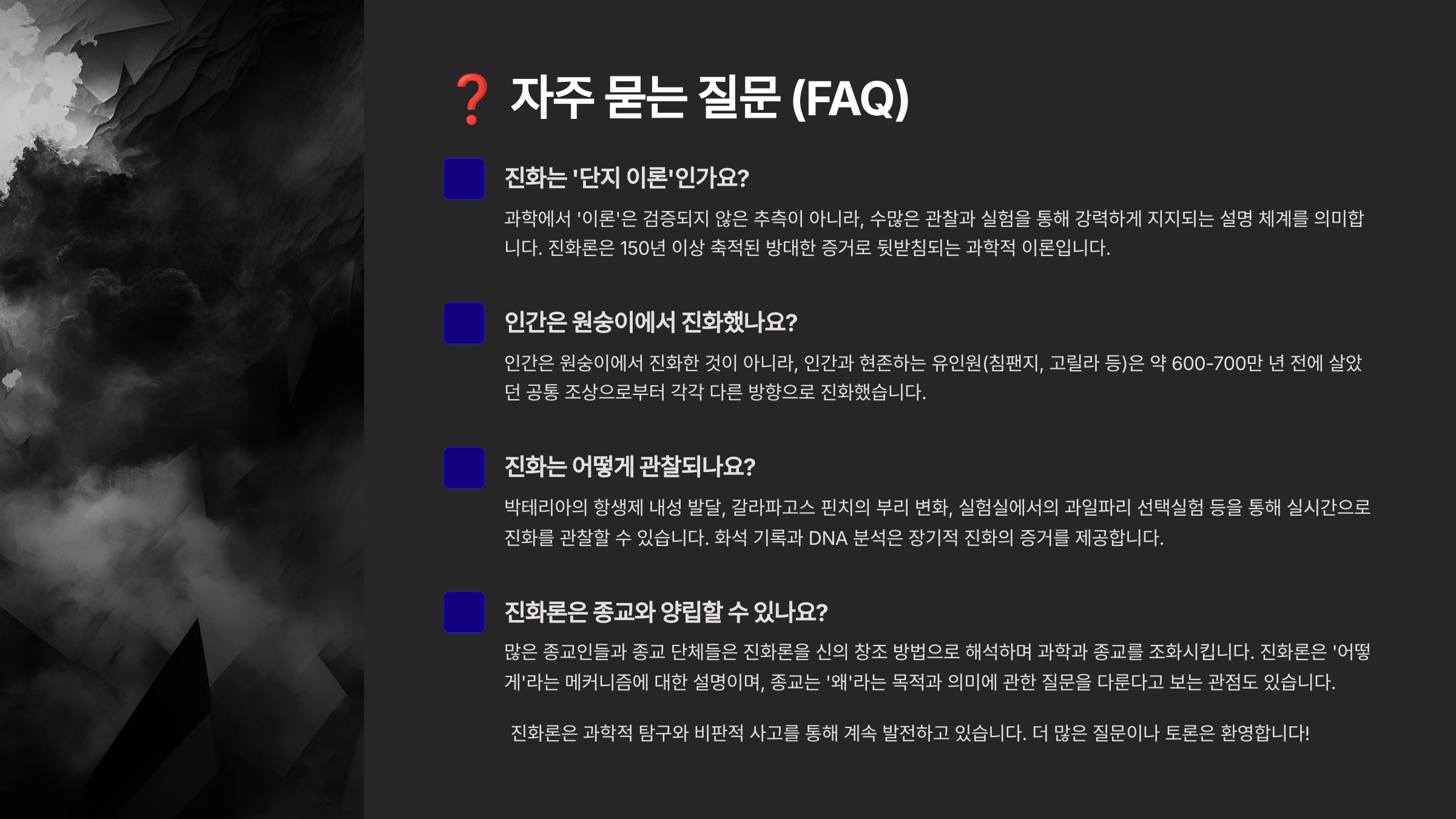 A2. 과학에서 '이론'은 단순한 가설이 아니라 수많은 실험과 관찰을 통해 검증된 강력한 설명 모델이에요. 진화론도 그런 의미에서 과학적 사실을 설명하는 이론이에요. 📘