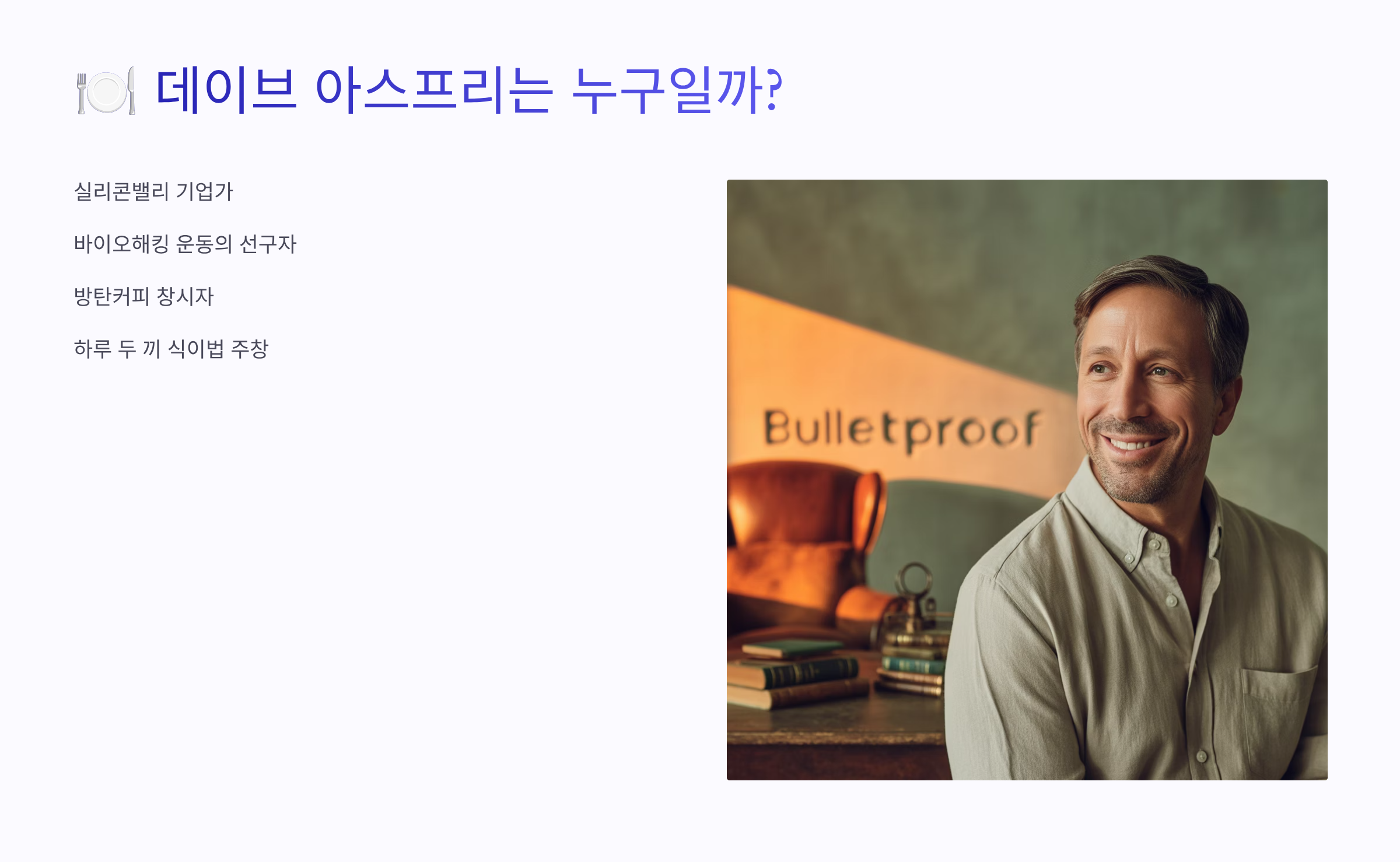 데이브 아스프리는 실리콘밸리 출신의 사업가이자 ‘바이오해킹’ 운동을 이끈 대표적인 인물이랍니다. 그가 처음 대중에게 알려지게 된 계기는 바로 '방탄커피(Bulletproof Coffee)' 덕분이에요.