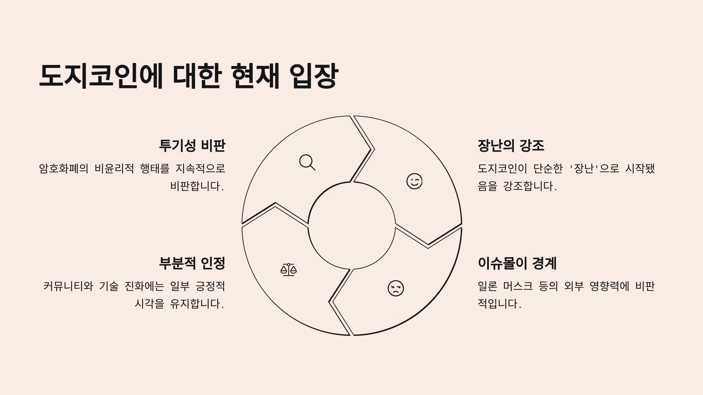 이 표를 보면 알 수 있듯, 마커스는 도지코인의 성장을 인정하면서도, 본인이 만든 세계가 자신을 압도하는 걸 경계하고 있어요. 재미로 만든 것에서 이렇게 큰 파장이 생긴다는 건, 개발자 입장에선 엄청난 부담이기도 하겠죠. 🌀
