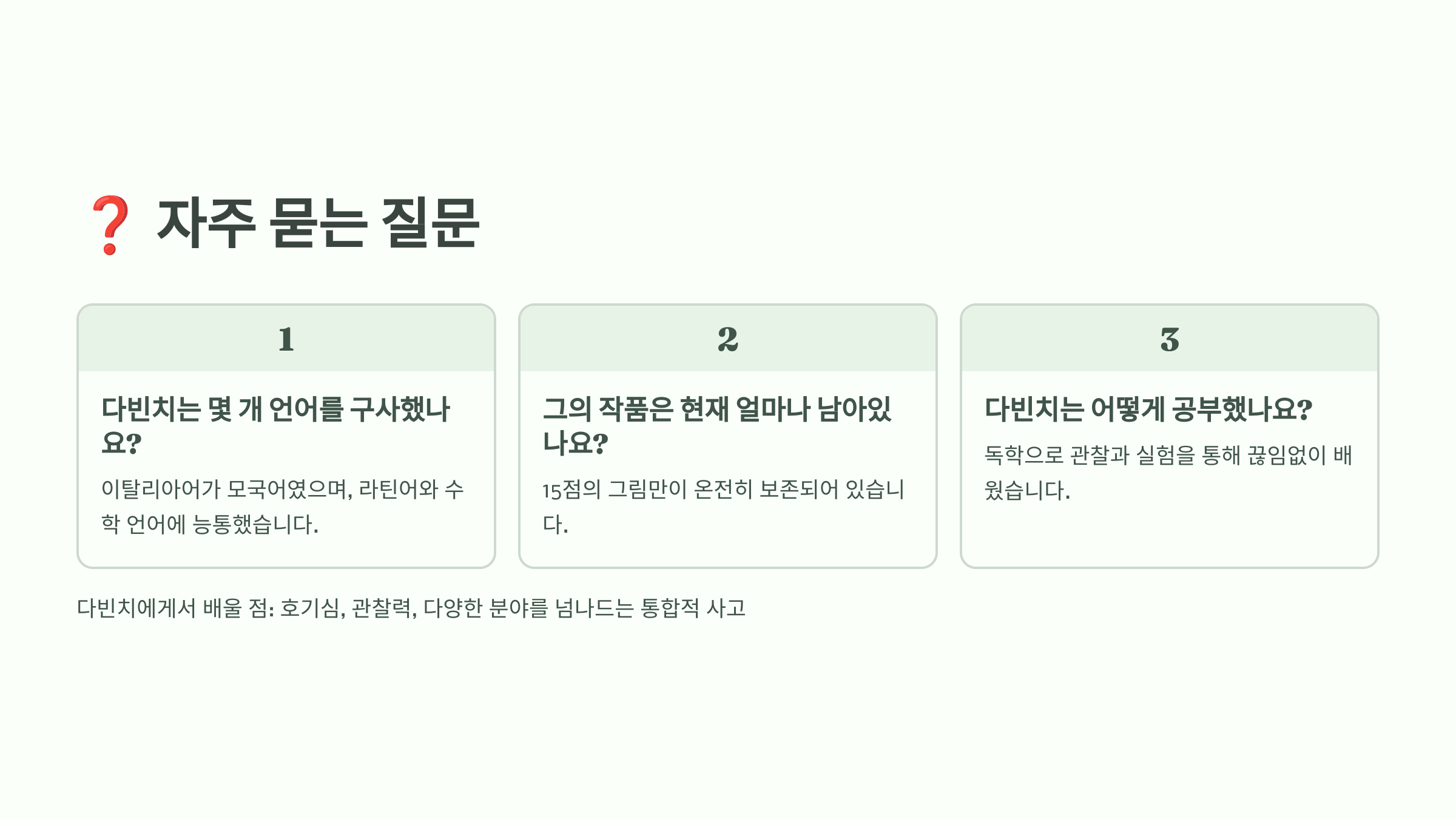 ❓ 지금까지 다빈치의 모든 면을 살펴봤다면, 이제 여러분이 가장 궁금해하는 질문들을 FAQ 형식으로 정리해볼게요!