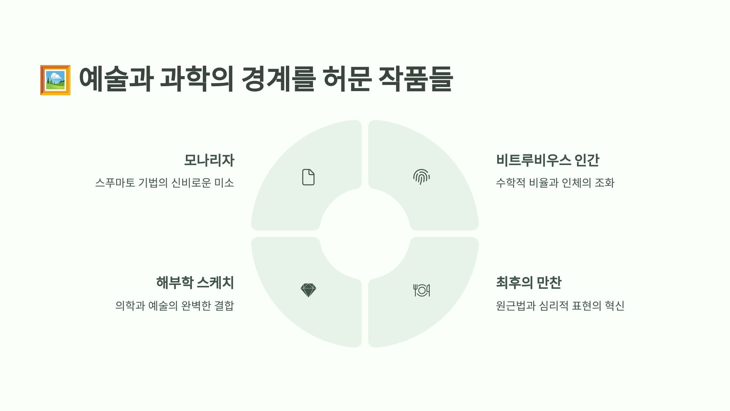 레오나르도 다빈치는 단순히 아름다운 그림을 그리는 예술가가 아니었어요. 그는 그림 속에 수학, 광학, 해부학, 심리학, 철학까지 녹여낸 '지식의 화가'였죠. 그의 대표작인 ‘모나리자’, ‘최후의 만찬’, ‘비트루비우스 인간’은 과학과 예술의 융합을 보여주는 상징적인 작품이에요.