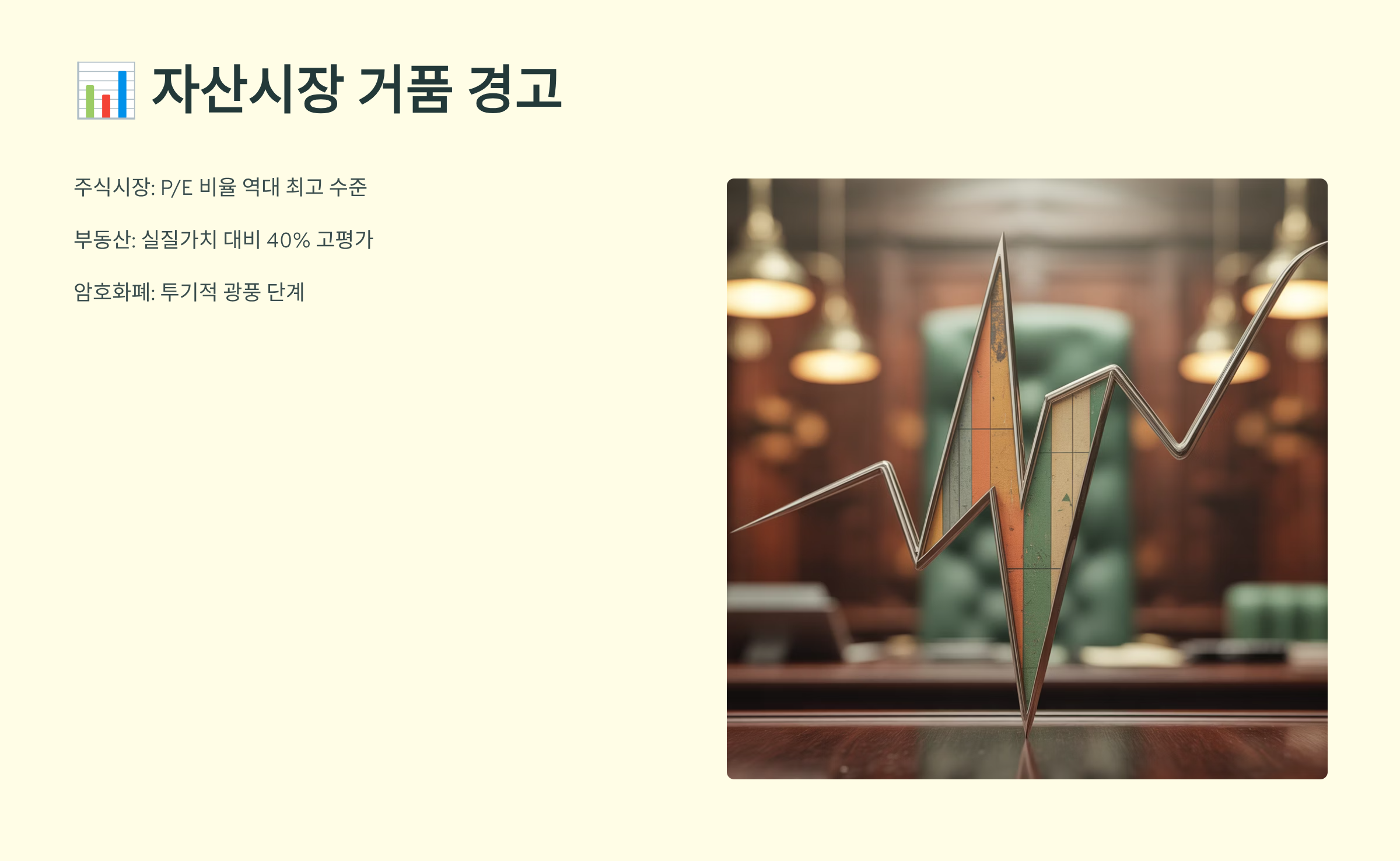 자산 거품의 무서운 점은 붕괴가 갑작스럽게 일어난다는 거예요. 2000년 IT 버블, 2008년 서브프라임 사태처럼요. 특히 이번에는 모든 자산이 동시에 고평가되어 있어 '동시다발 붕괴'의 가능성이 커요.