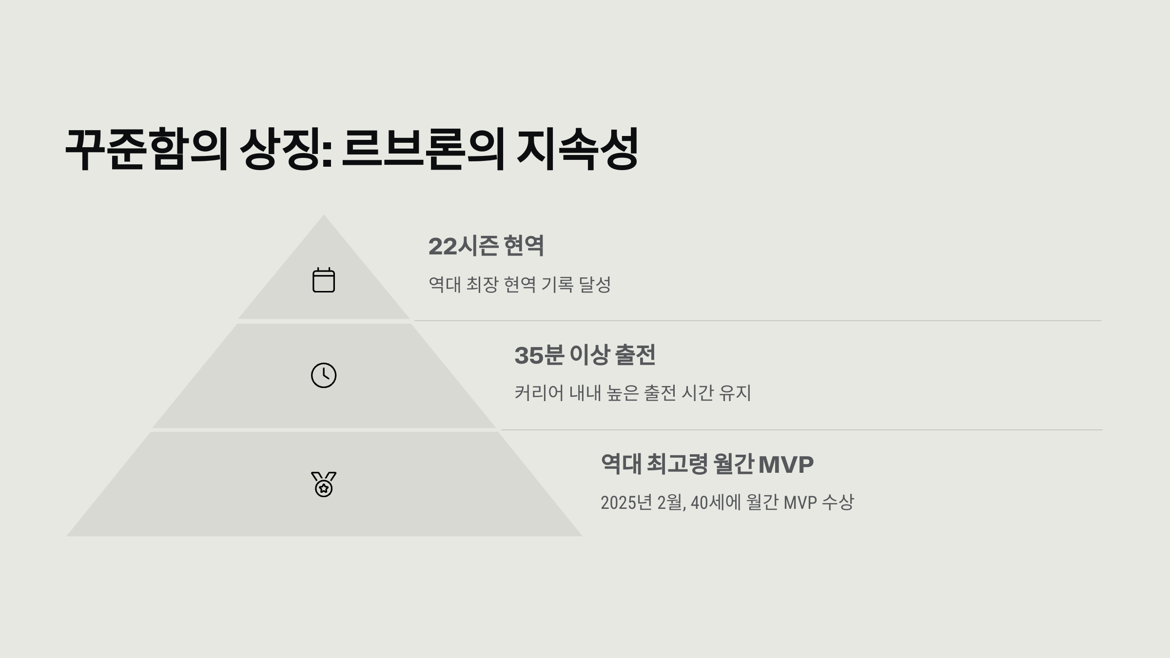 이런 기록은 하루아침에 만들어지는 게 아니에요. 매년 70경기 이상을 소화하면서 꾸준히 25점 이상을 득점해야만 가능한 숫자들이랍니다. 르브론은 정말 시간과 싸우며 모든 한계를 넘은 선수예요. 🕒