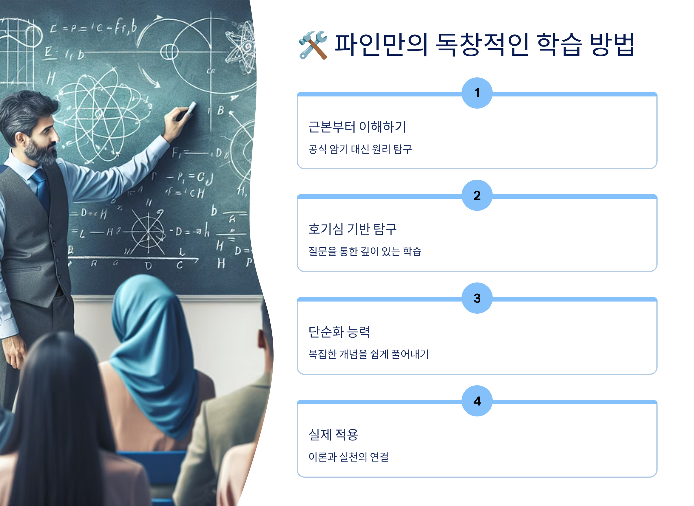 파인만은 개념을 '암기'하는 방식이 아니라 ‘진짜로 이해’하는 방법으로 공부했어요. 특히 그는 '모른다'는 사실을 두려워하지 않았고, 어떤 개념이든 자신이 완전히 설명할 수 없으면 그건 '아직 이해하지 못한 것'이라 여겼죠. 이것이 바로 그 유명한 ‘파인만 기법(Feynman Technique)’의 기초이기도 해요.