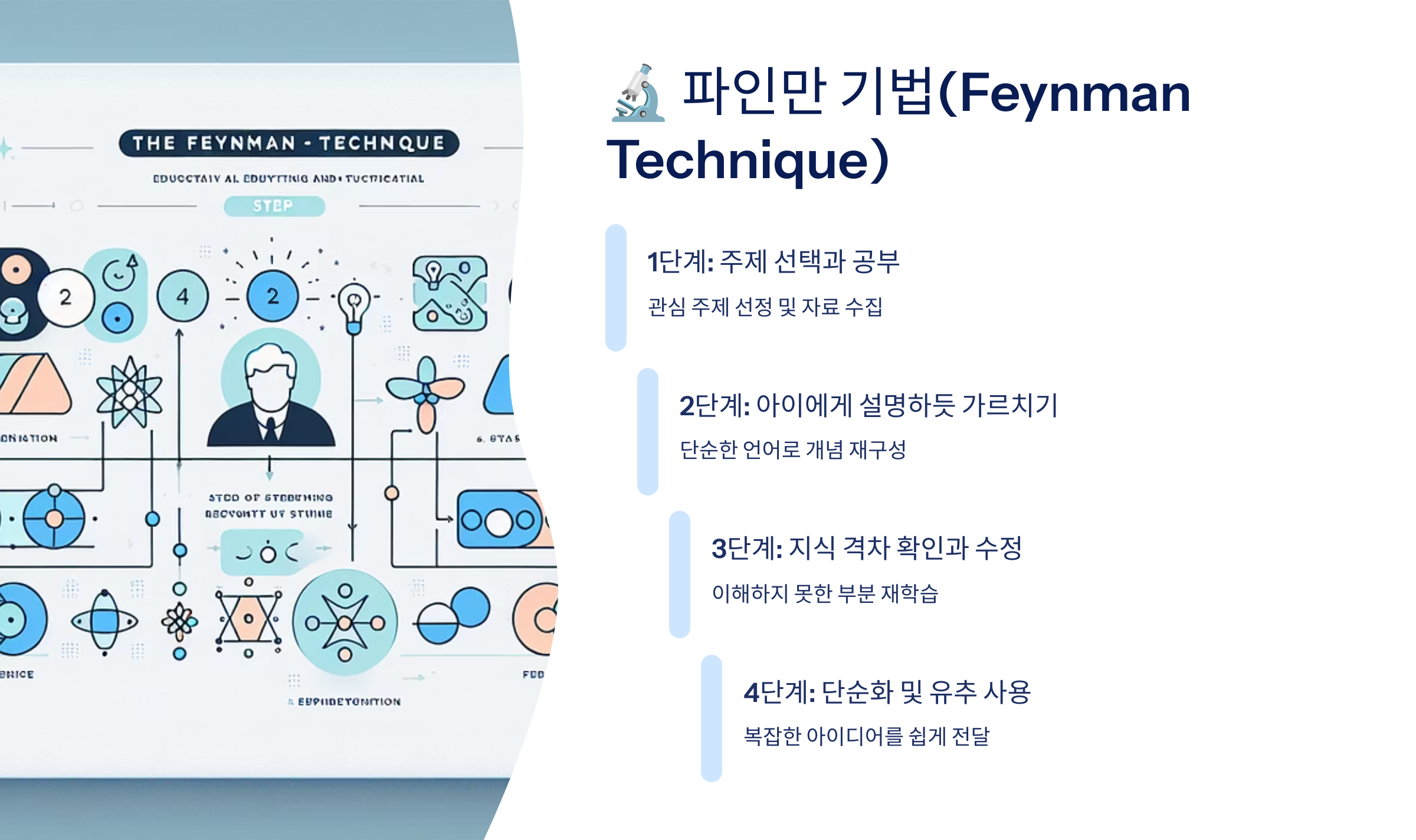이 표는 파인만이 실제로 실천한 학습 사이클이에요. 단순하지만 이 과정을 지켜내는 게 쉽지는 않죠. 하지만 이 방식은 공부뿐 아니라 발표, 보고서 작성, 강의 준비에도 엄청난 효과를 보여줘요.