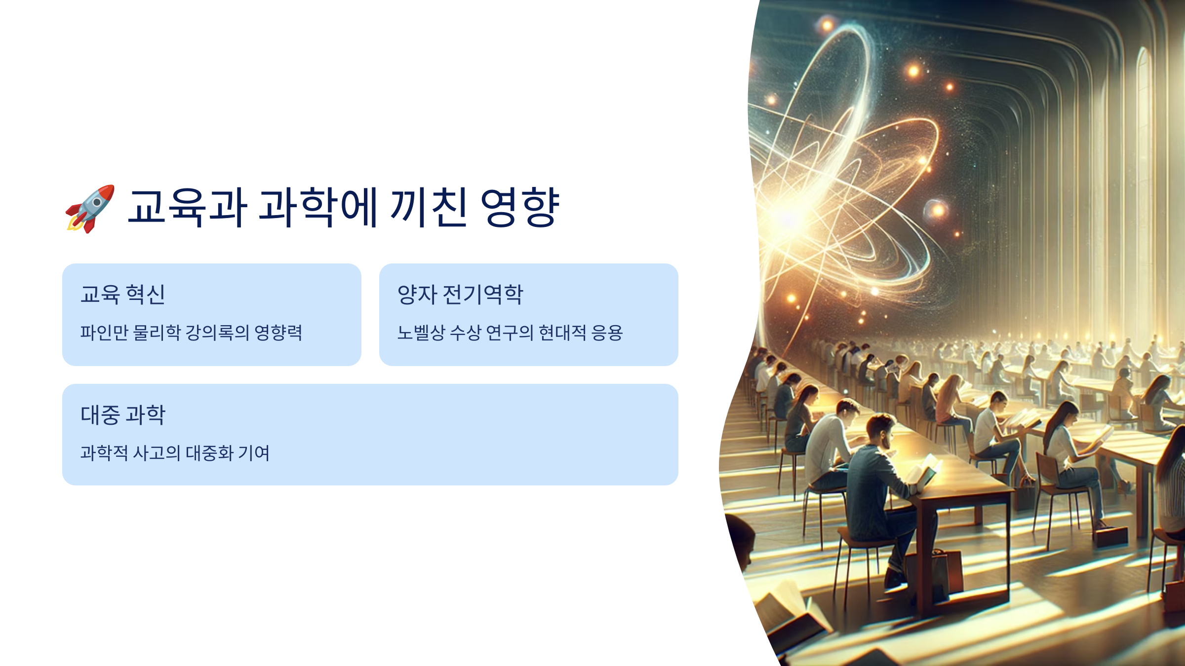 파인만의 영향력은 학문을 넘어서 교육 방법 자체를 바꾸는 계기가 되었어요. 요즘 학생들이 유튜브로 배우는 방식, ‘쉽고 재미있게 가르쳐야 한다’는 온라인 콘텐츠 철학까지도 사실 파인만의 DNA가 녹아 있다고 볼 수 있어요. 📺