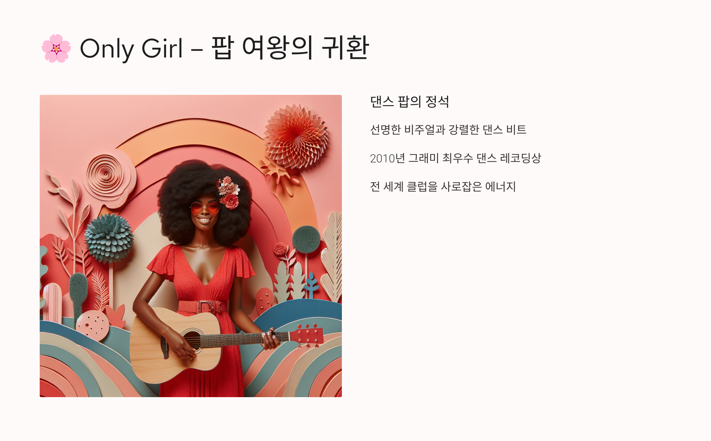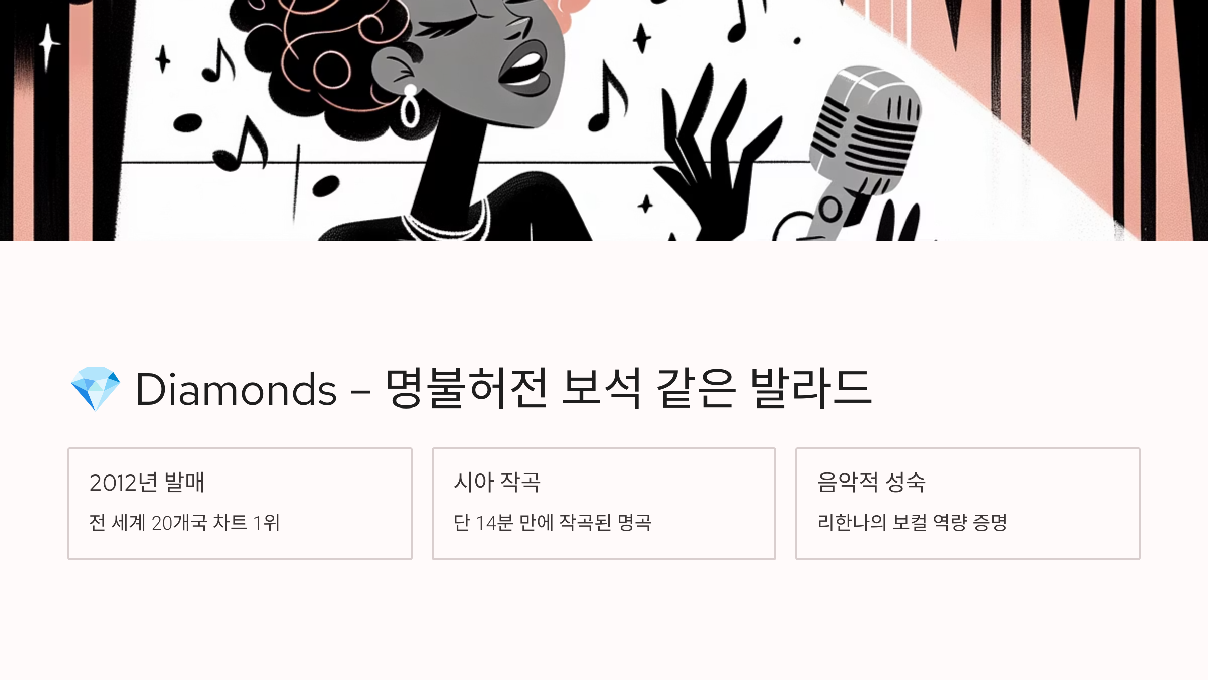이 곡은 리한나의 ‘다시 태어난 순간’을 대표해요. 그녀의 새로운 시대가 시작된 곡이라 해도 과언이 아니에요. 🌸