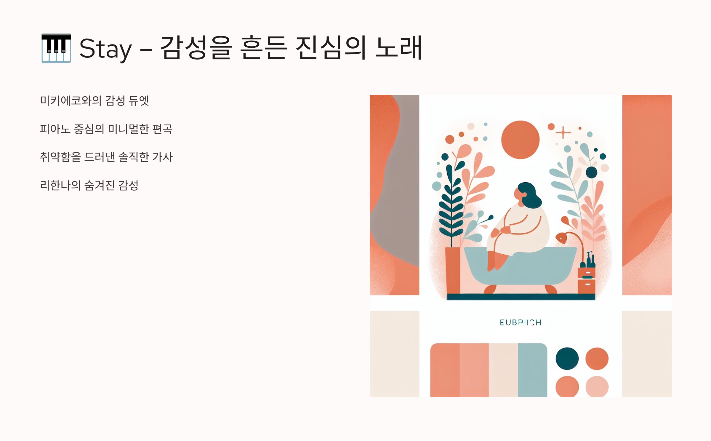‘Stay’는 리한나가 단순히 댄스나 트렌디한 사운드가 아닌, 감정을 직접 건드릴 수 있는 아티스트라는 걸 증명한 곡이에요. 그녀의 진심이 묻어난 명곡이죠. 🎹