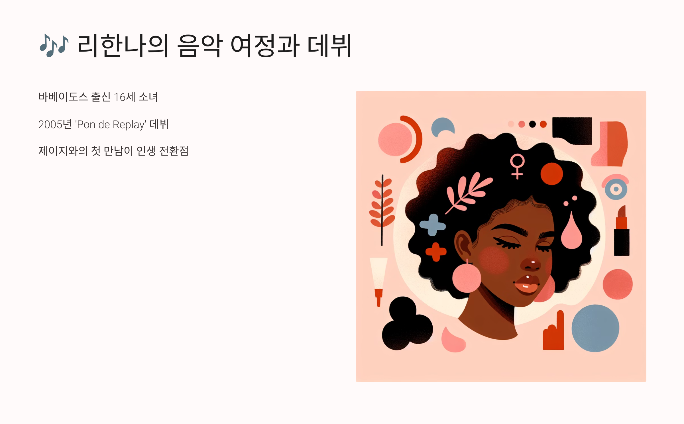 리한나는 1988년 카리브해의 작은 섬나라 바베이도스에서 태어났어요. 어린 시절부터 음악에 대한 애정이 깊었던 그녀는 마이클 잭슨, 머라이어 캐리, 비욘세의 음악을 들으며 가수의 꿈을 키웠죠. 열네 살 때 처음으로 친구들과 함께 걸 그룹을 결성해 오디션을 보았고, 그 자리를 통해 운명적으로 인연을 맺게 된 사람이 바로 미국의 프로듀서 에반 로저스였답니다.