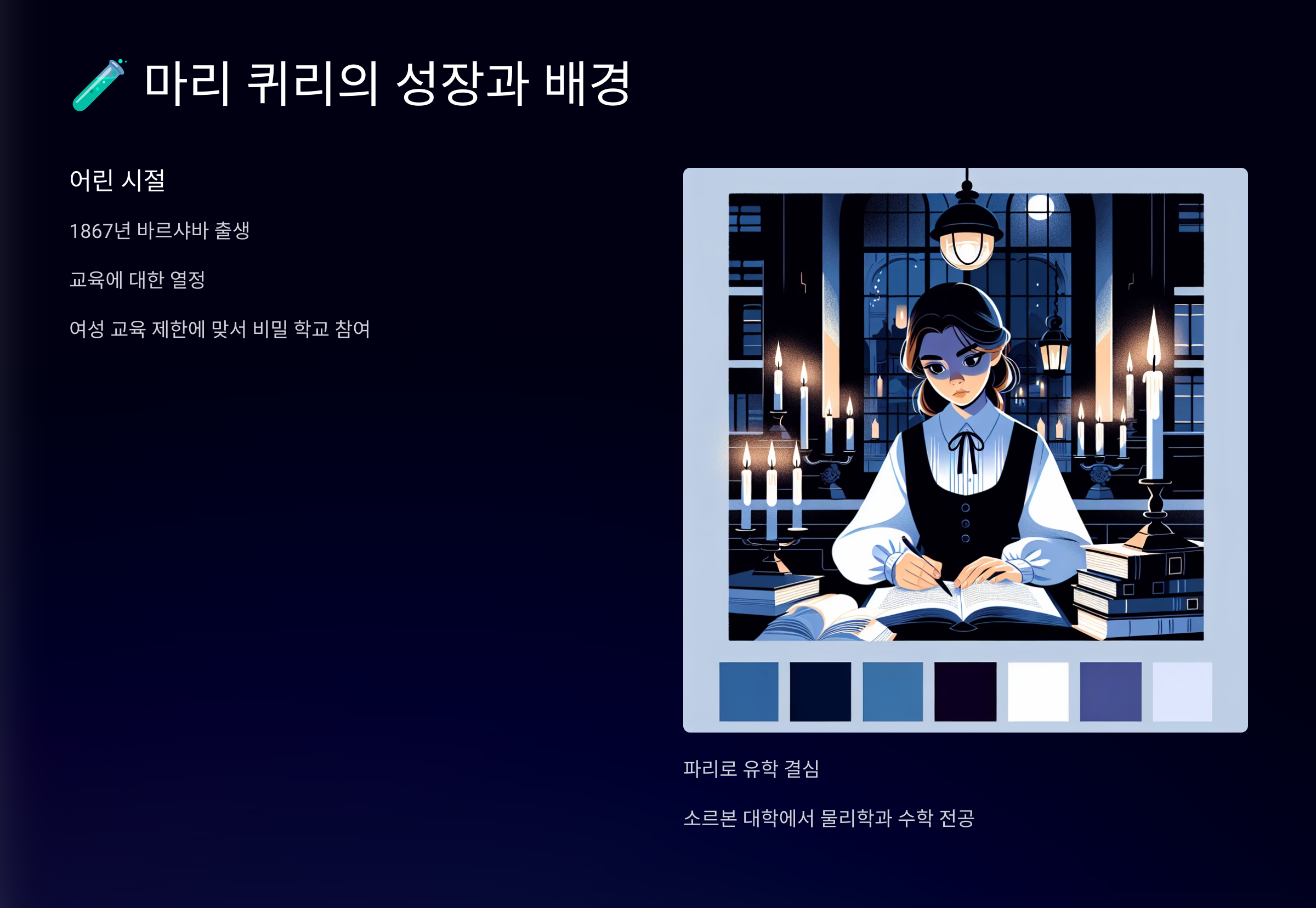 마리 퀴리는 여성으로서 당대 사회가 정해놓은 벽을 넘었어요. 그녀가 지식의 자유를 위해 선택한 이 여정은 지금도 많은 여성 과학자들의 롤모델이 되고 있답니다.