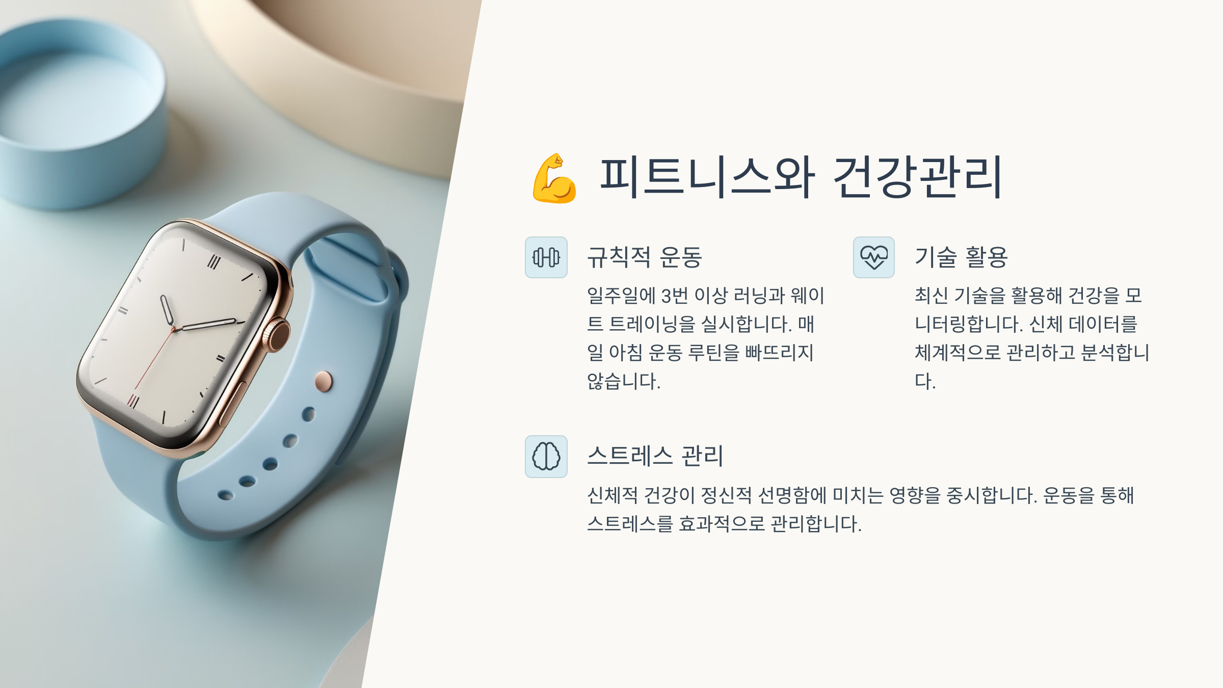 하루 중 가장 먼저 하는 일 중 하나는 간단한 스트레칭과 짧은 홈트레이닝이에요. “운동을 통해 몸과 뇌를 함께 깨운다”는 그의 철학에 따라, 루틴은 신체 활동에서 출발해요. 이는 업무 효율을 극대화하기 위한 전략이기도 해요.