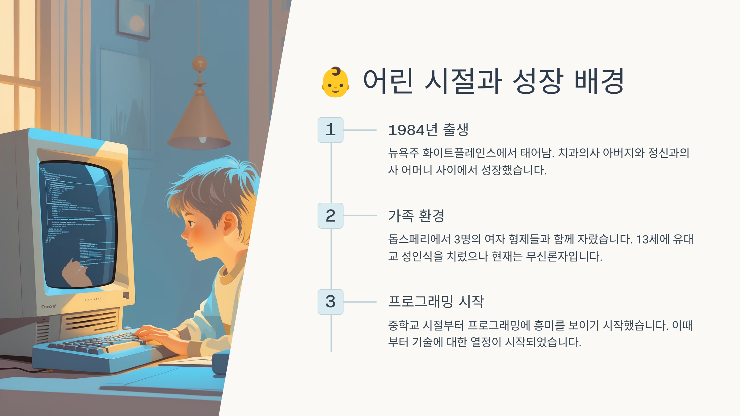 마크 저커버그는 1984년 뉴욕에서 태어났어요. 어릴 때부터 컴퓨터와 수학에 빠져 있었고, 중학생 시절에는 이미 인공지능 기반의 메신저 'ZuckNet'을 만들어 가족 간 소통에 사용했어요. 이런 호기심과 창의력이 그를 조기에 두각을 나타내게 했답니다.