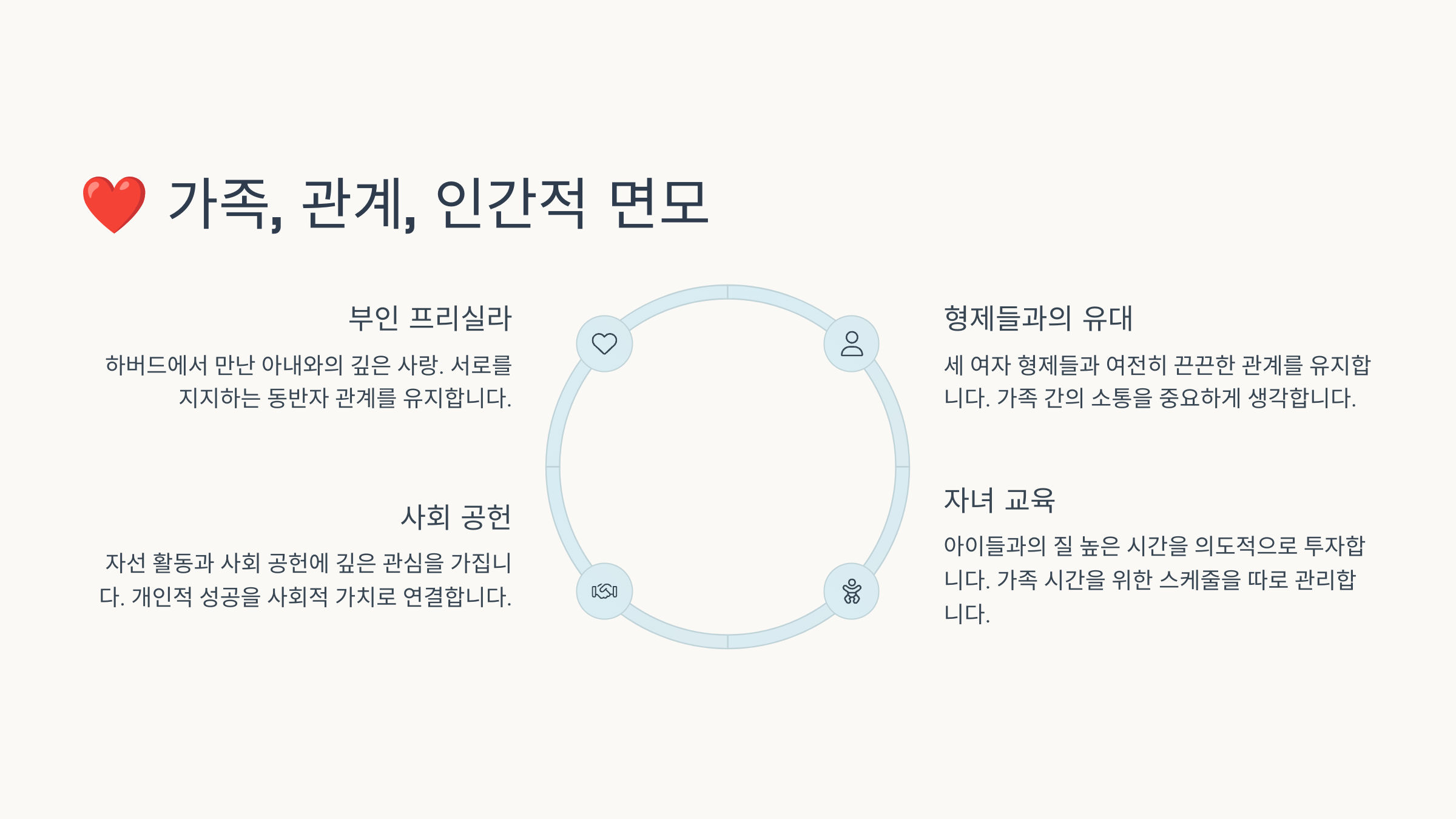 마크 저커버그는 가족과의 시간도 절대 놓치지 않아요. 아이들과 함께 놀아주는 시간, 아내 프리실라와 식사하는 시간은 스케줄에 정식으로 포함돼 있어요. 그는 기술보다 사람이 먼저라고 항상 말해요.