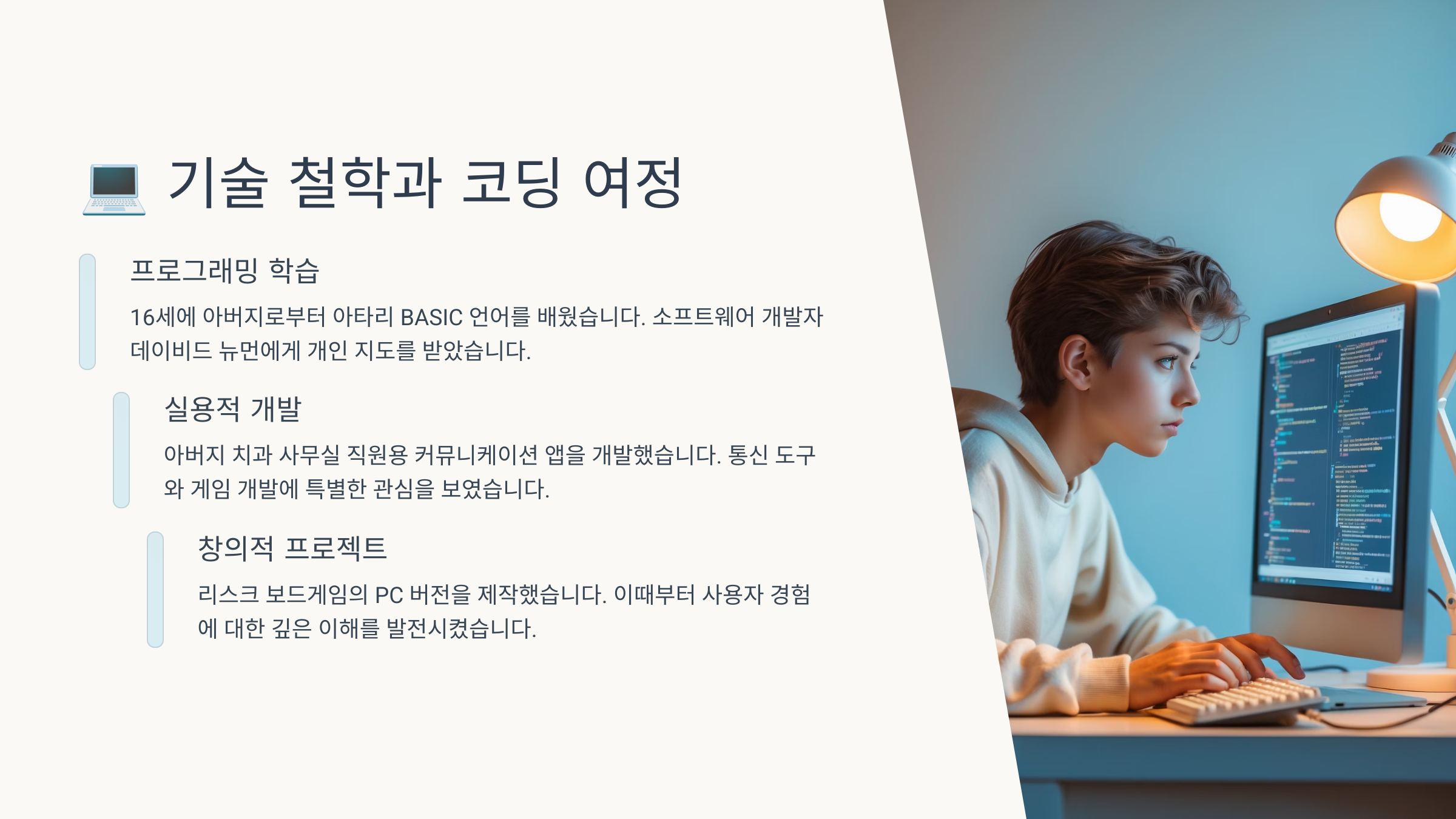 어릴 적부터 그는 단순한 게임보다 툴을 만드는 데에 더 열정을 쏟았어요. 이는 현재 메타(Meta)의 철학에도 그대로 반영되고 있답니다. "도구를 통해 인간의 연결을 확장하자"는 생각은 그의 어린 시절부터 시작된 거예요.