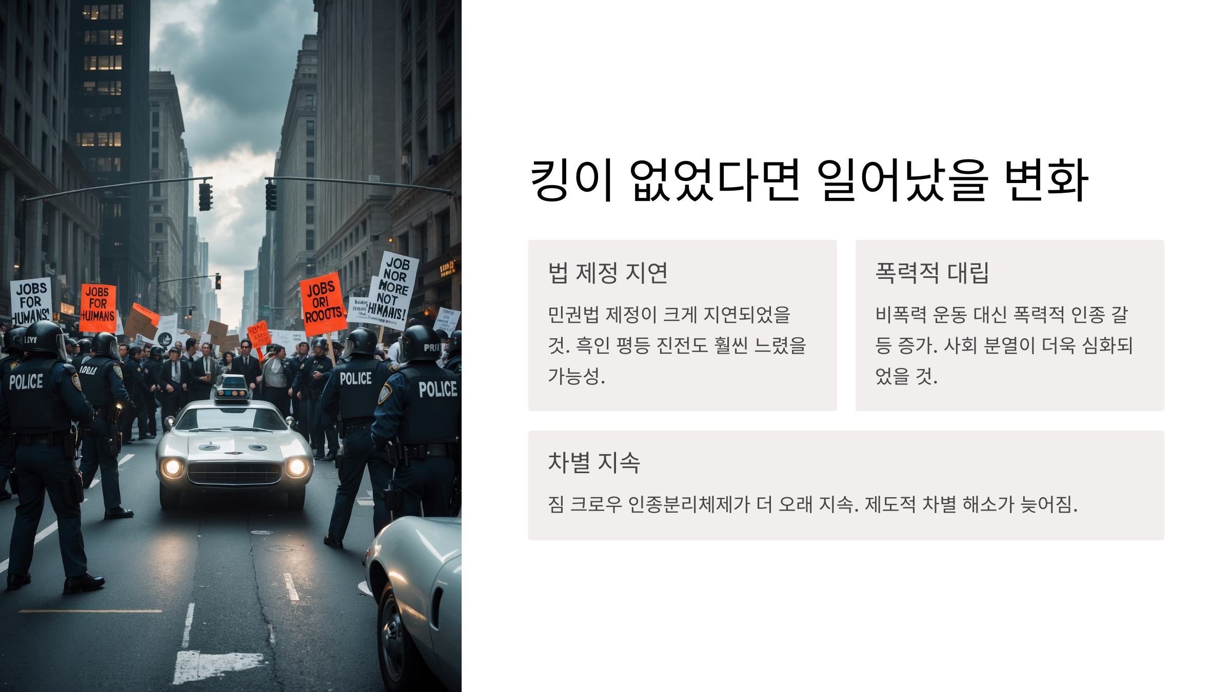 이 글에서는 킹의 생애부터 그가 펼친 운동, 그로 인해 일어난 법 제정의 과정, 그리고 킹이 없는 경우 어떤 대안의 역사적 흐름이 있었을지까지 깊이 있게 들여다볼게요.