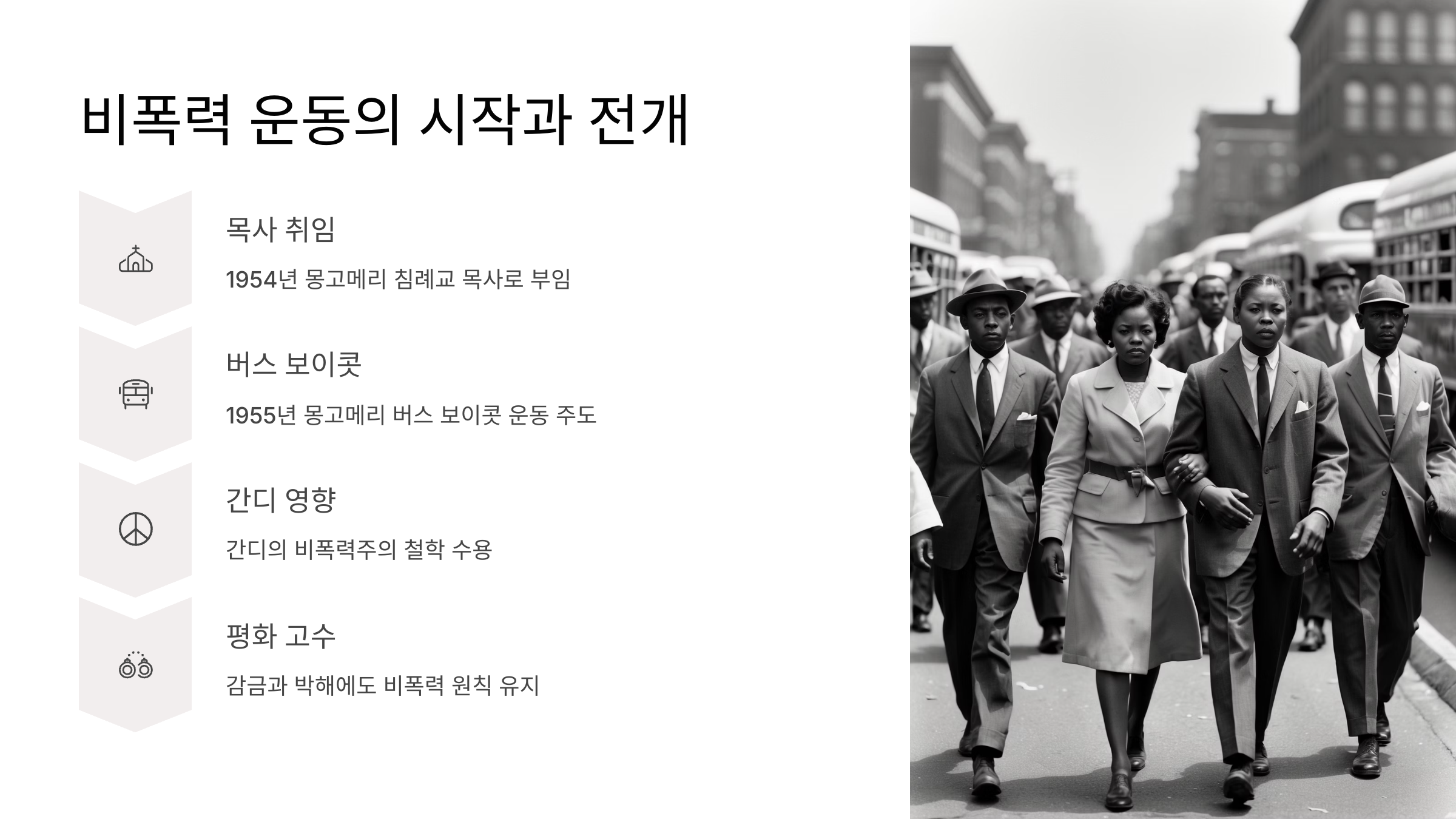 1955년, 로자 파크스가 버스에서 백인에게 자리를 양보하지 않았다는 이유로 체포되면서 몽고메리 버스 보이콧 운동이 시작됐어요. 이때 주도적으로 나선 인물이 바로 킹이었죠. 그는 당시 26살의 젊은 목사였지만, 강한 신념으로 사람들을 이끌었답니다.