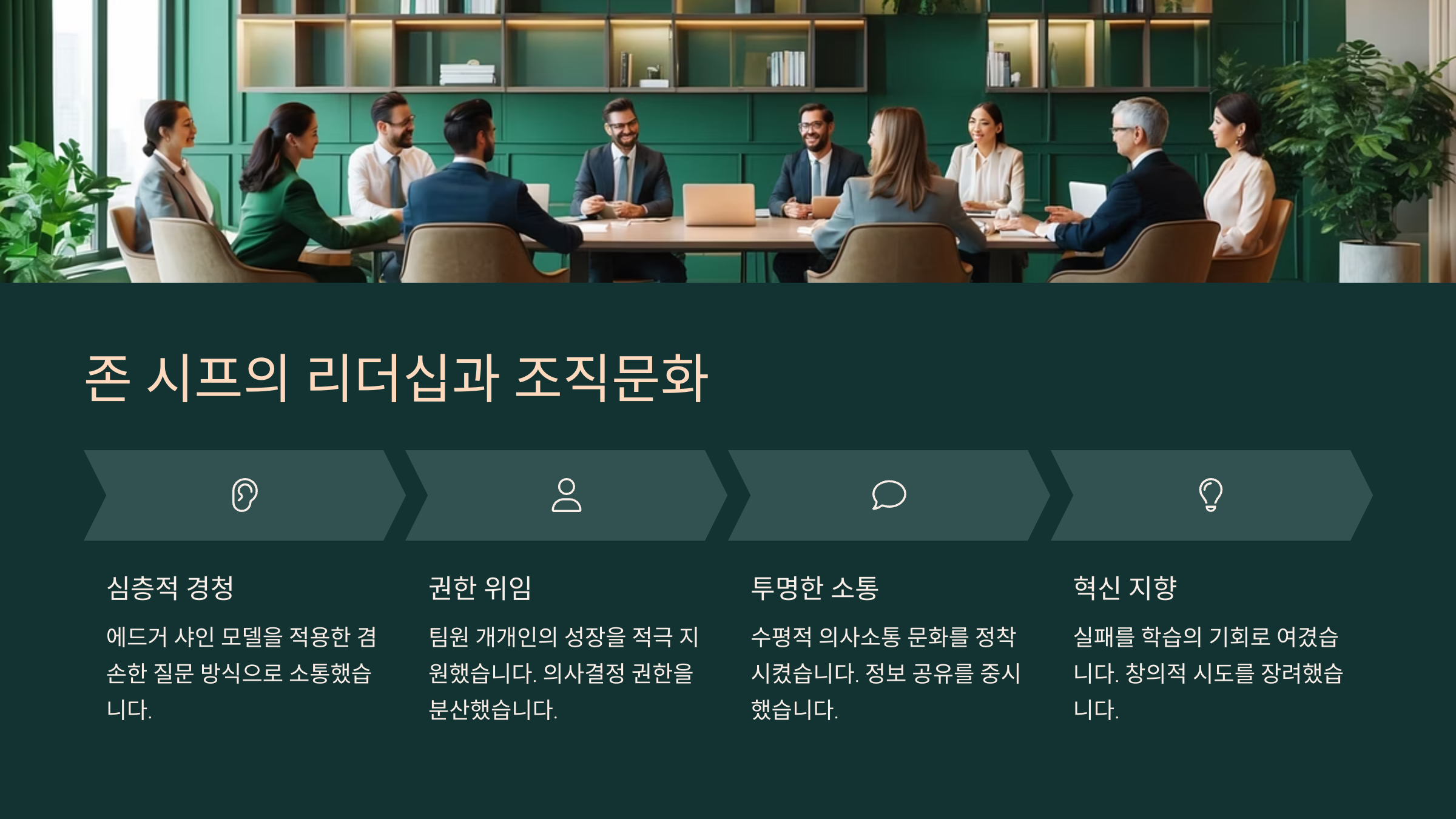 존은 사내 회의에서 누구나 자신의 의견을 말할 수 있도록 분위기를 이끌었어. 사원들의 작은 아이디어라도 귀 기울여 듣고, 직접 실행해보려 했지. 이런 문화가 회사 전체의 혁신으로 이어졌어.