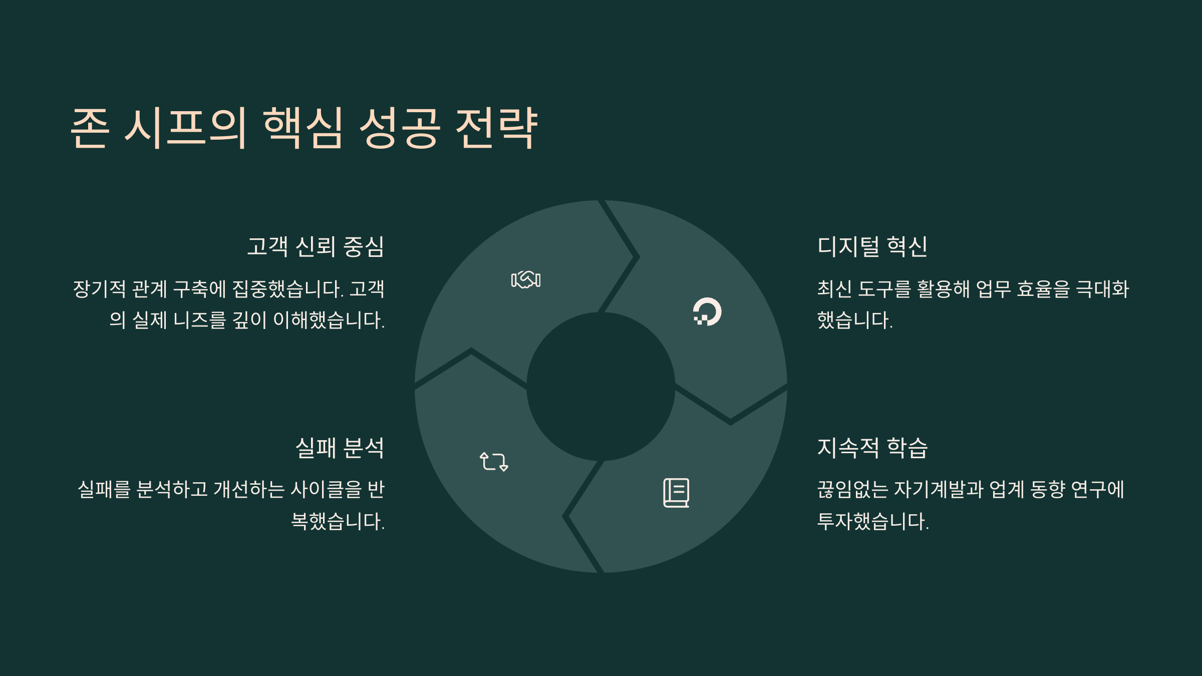 존 시프의 성공에는 몇 가지 비밀이 숨어있어. 첫 번째는 "고객 중심 사고"야. 그는 항상 고객의 필요를 먼저 파악했지. 단순한 상품 설명이 아니라, 고객이 실제로 어떤 상황에 처했는지를 듣고 맞춤형 솔루션을 제시했어.