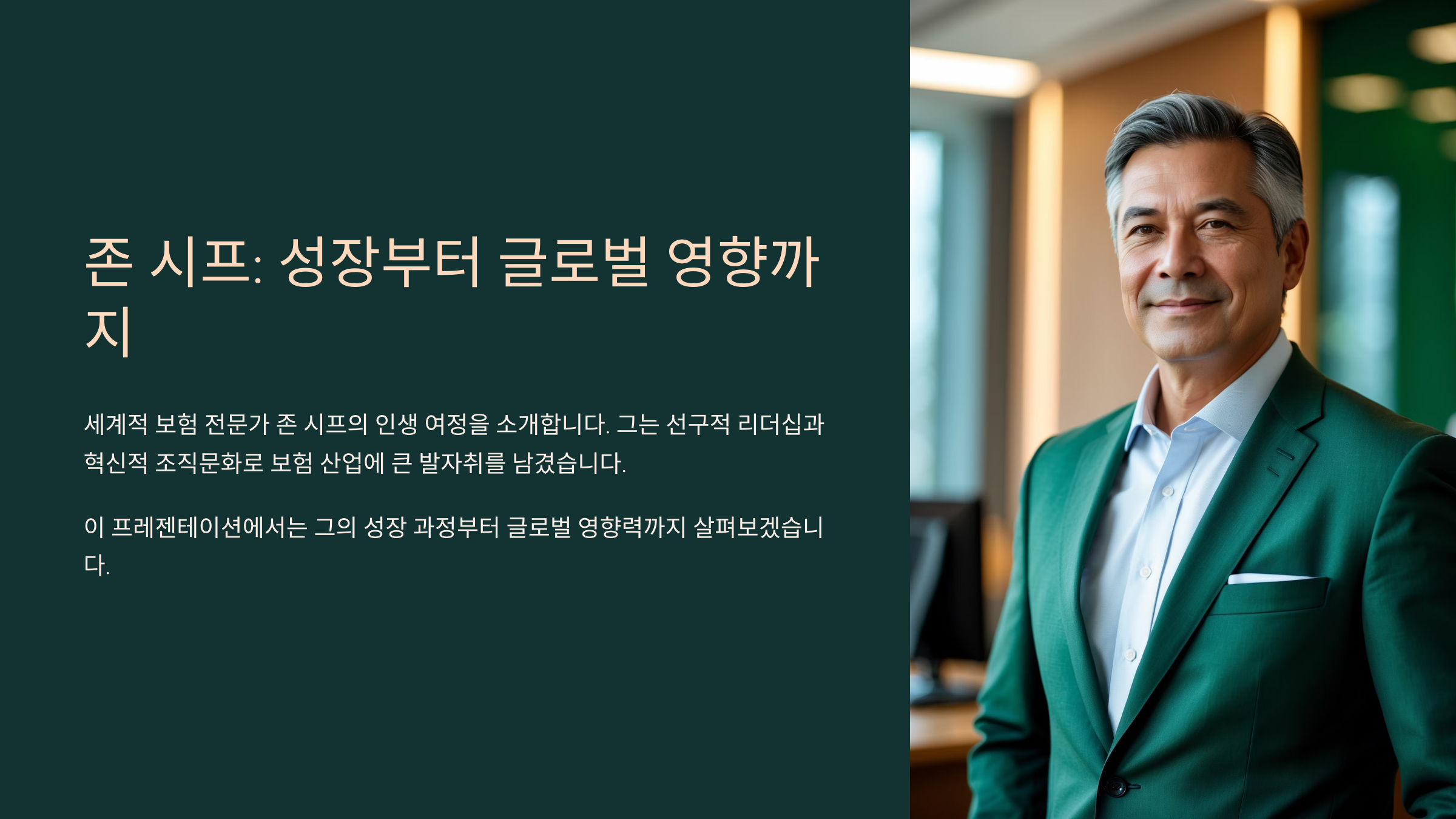 존 시프는 새로운 시장 개척과 혁신이 늘 사람을 위한 것이어야 한다고 믿었어. 그래서 그는 보험을 단순한 금융상품이 아니라, 사람의 미래를 지키는 필수품으로 만들었지.