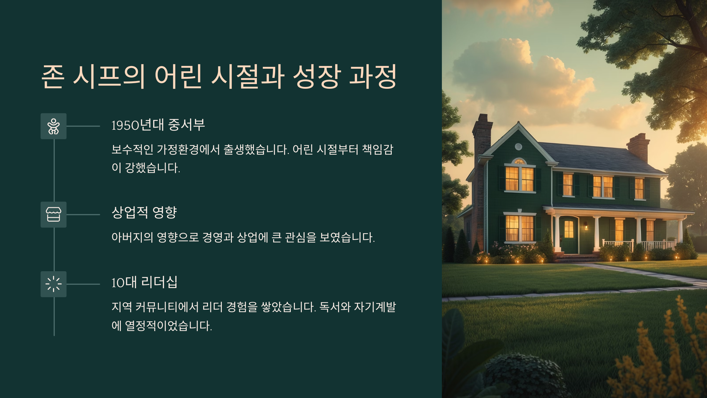 존 시프는 1950년대 미국 중서부에서 태어났어. 어린 시절부터 부모님의 성실한 모습에 큰 영향을 받았지. 그의 부모님은 지역사회에서 소상공인을 도우며 늘 믿음과 정직을 중요시했대. 이런 가정환경은 자연스럽게 존의 가치관으로 자리잡았어.