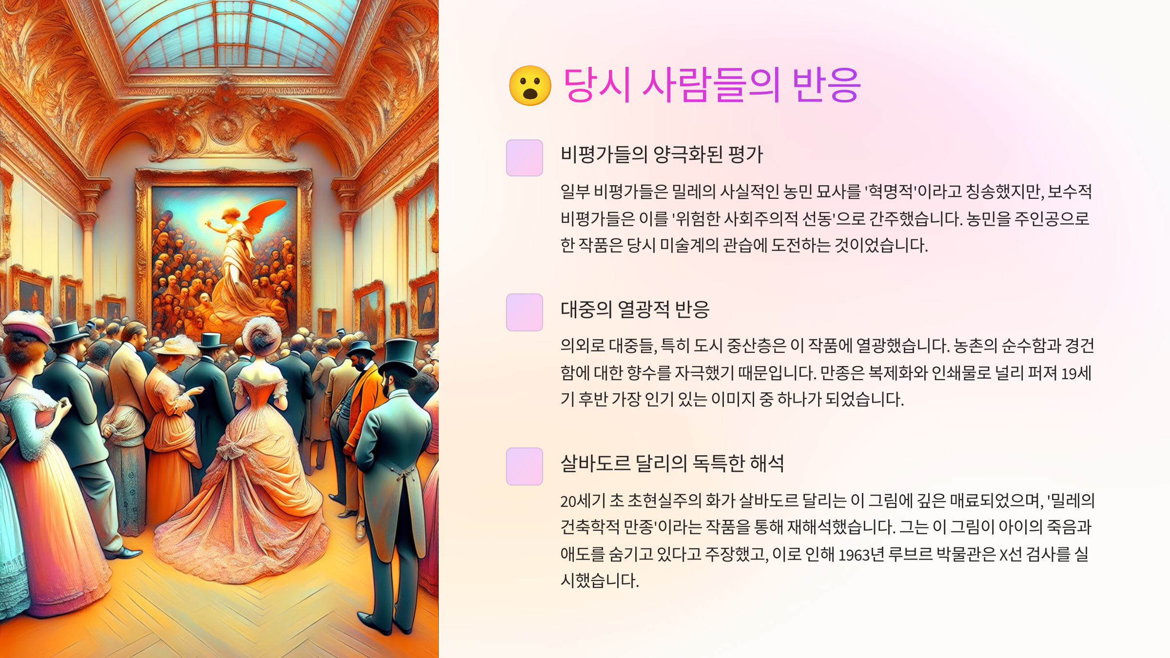 밀레는 자신의 작품이 사회를 비판하거나 정치적인 메시지를 담으려 했다고는 말하지 않았어요. 그는 단지 “진실을 말하고 싶었다”고만 이야기했어요. 하지만 그 ‘진실’은 당시 사회 상류층에게 큰 충격이었고, 일부는 이 작품을 매우 불편해했죠.