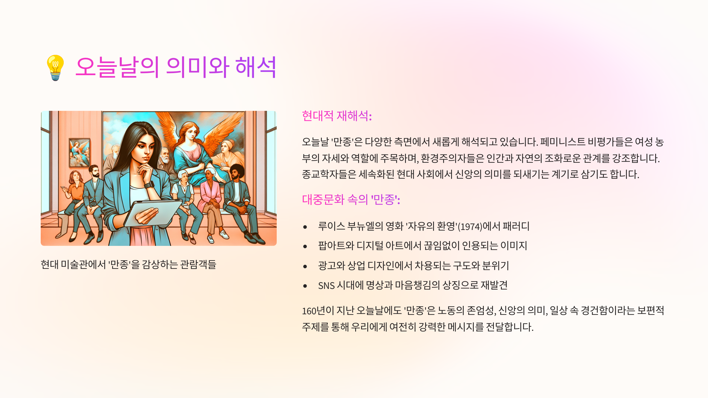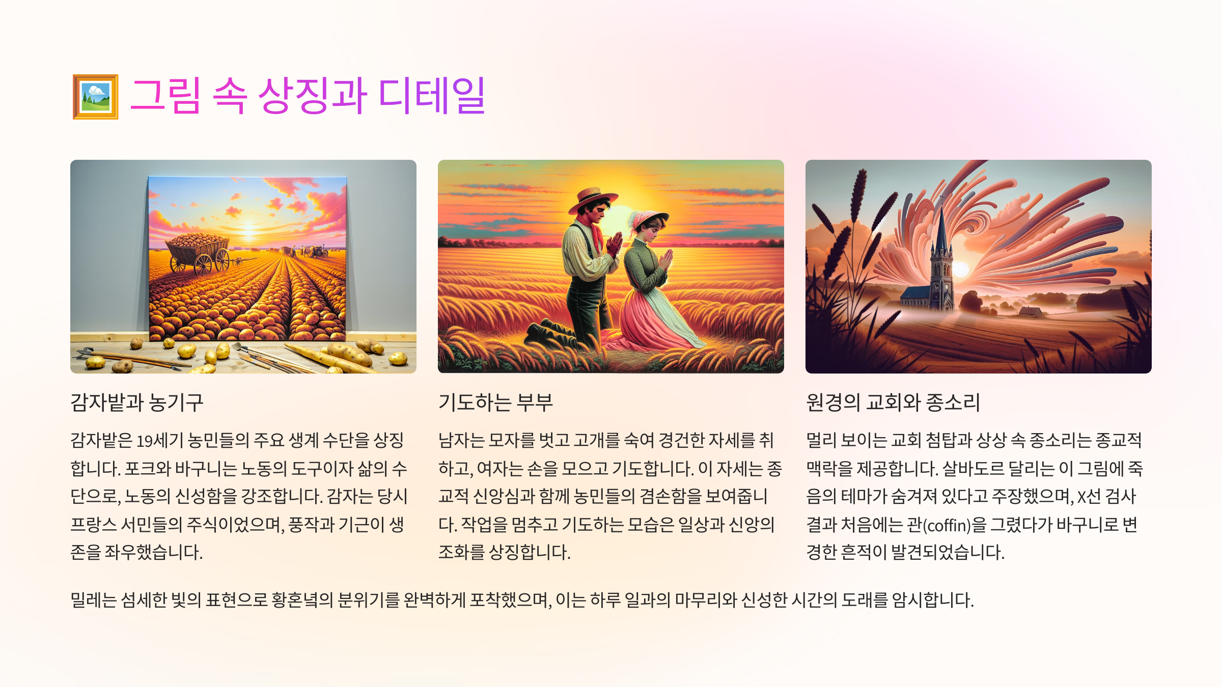 단순한 장면 안에서도 이렇게 다양한 해석과 메시지를 읽을 수 있다는 것, 그것이 바로 밀레의 작품이 지금도 감동을 주는 이유예요. 👀