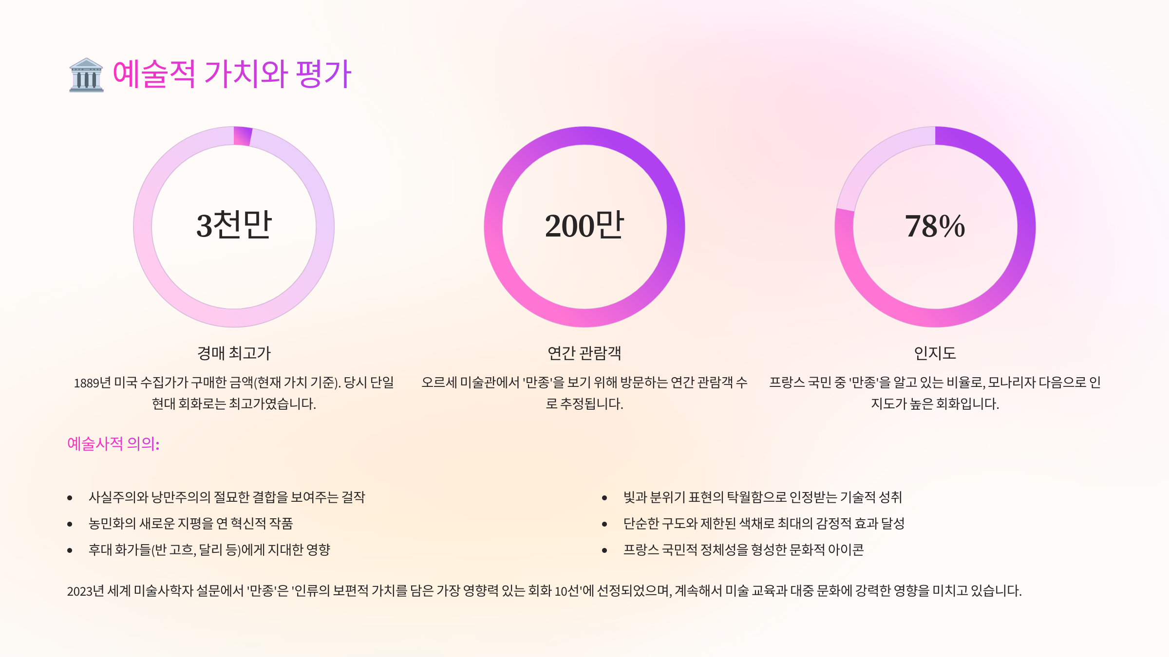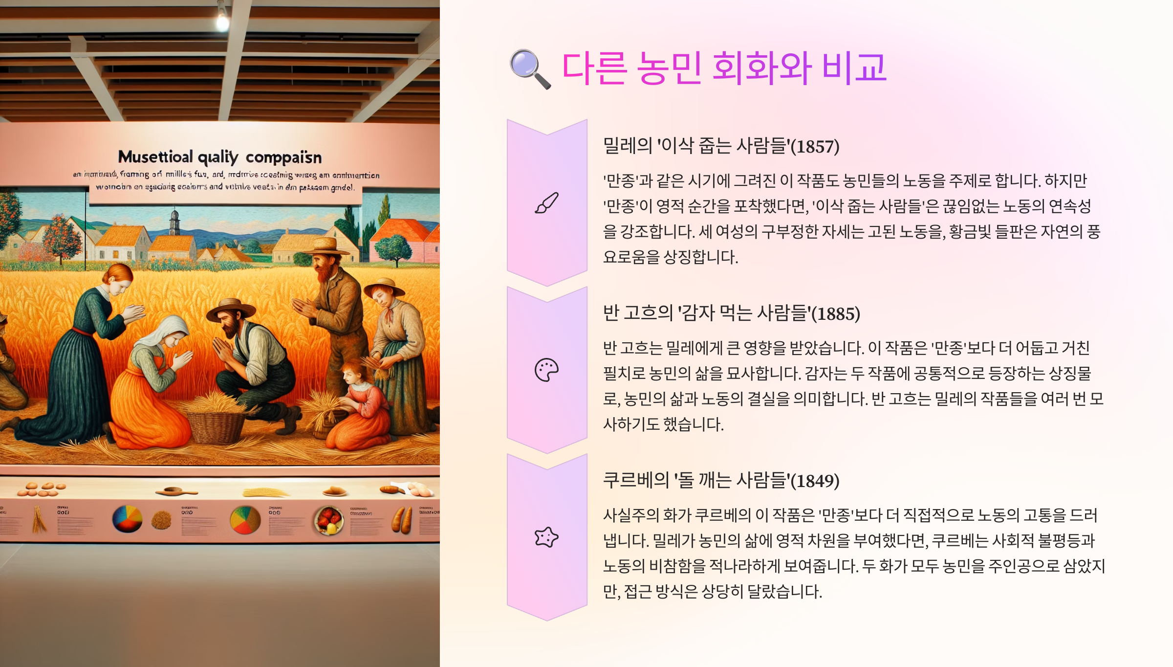 이 비교만 봐도 밀레가 얼마나 독창적인 시선으로 농민을 바라봤는지 알 수 있죠? 📚