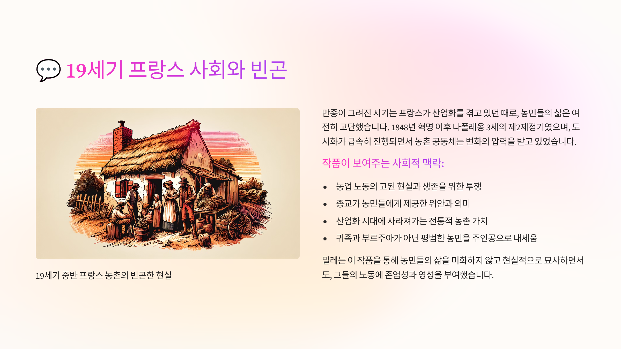이렇게 당시 프랑스 사회는 겉보기엔 풍요로웠지만, 이면에는 엄청난 불평등이 존재했어요. 밀레의 그림은 바로 그 '이면'을 세상 밖으로 끌어올린 거예요.