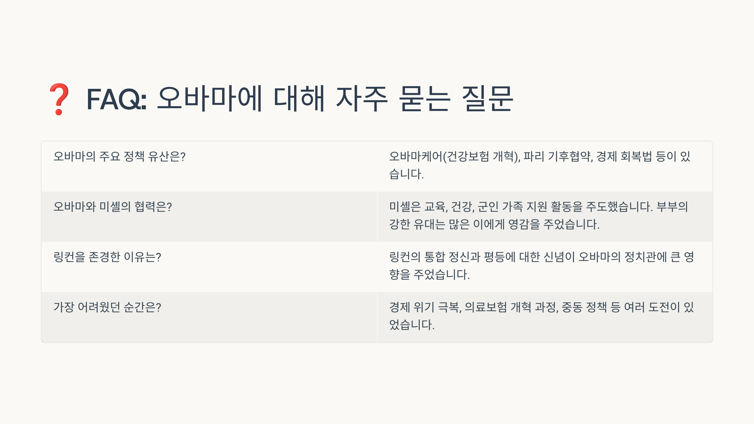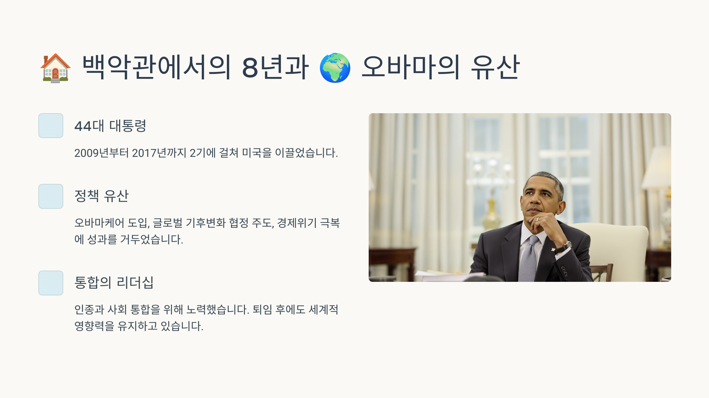 그의 재임 기간 동안 미국은 큰 위기를 극복했고, 글로벌 리더십의 방향도 바뀌었어요. 물론 비판도 있었지만, 오바마는 항상 ‘더 나은 나라를 위한 대화와 타협’을 강조했죠. 그의 리더십은 단호함보다는 공감과 소통에 기반했어요. 📘