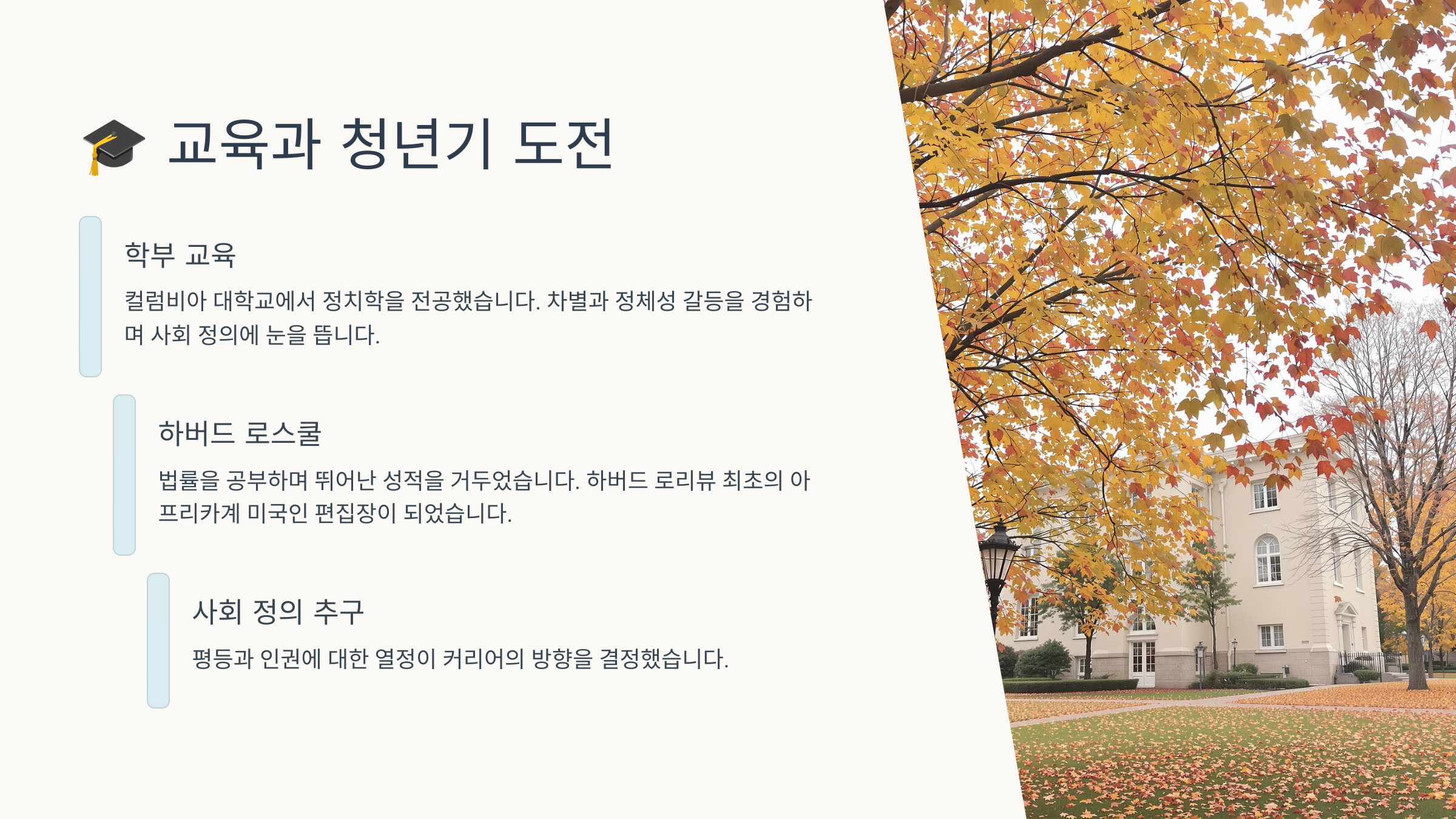이후 그는 더 넓은 무대에서 변화를 이끌기 위해 로스쿨 진학을 결심했고, 결국 세계 최고 수준의 하버드 로스쿨에 입학하게 돼요. 여기서도 그는 단순한 학생이 아닌 ‘하버드 로 리뷰’의 첫 흑인 편집장이라는 엄청난 성과를 이루게 되었죠. 당시 언론에서도 큰 화제가 되었어요!