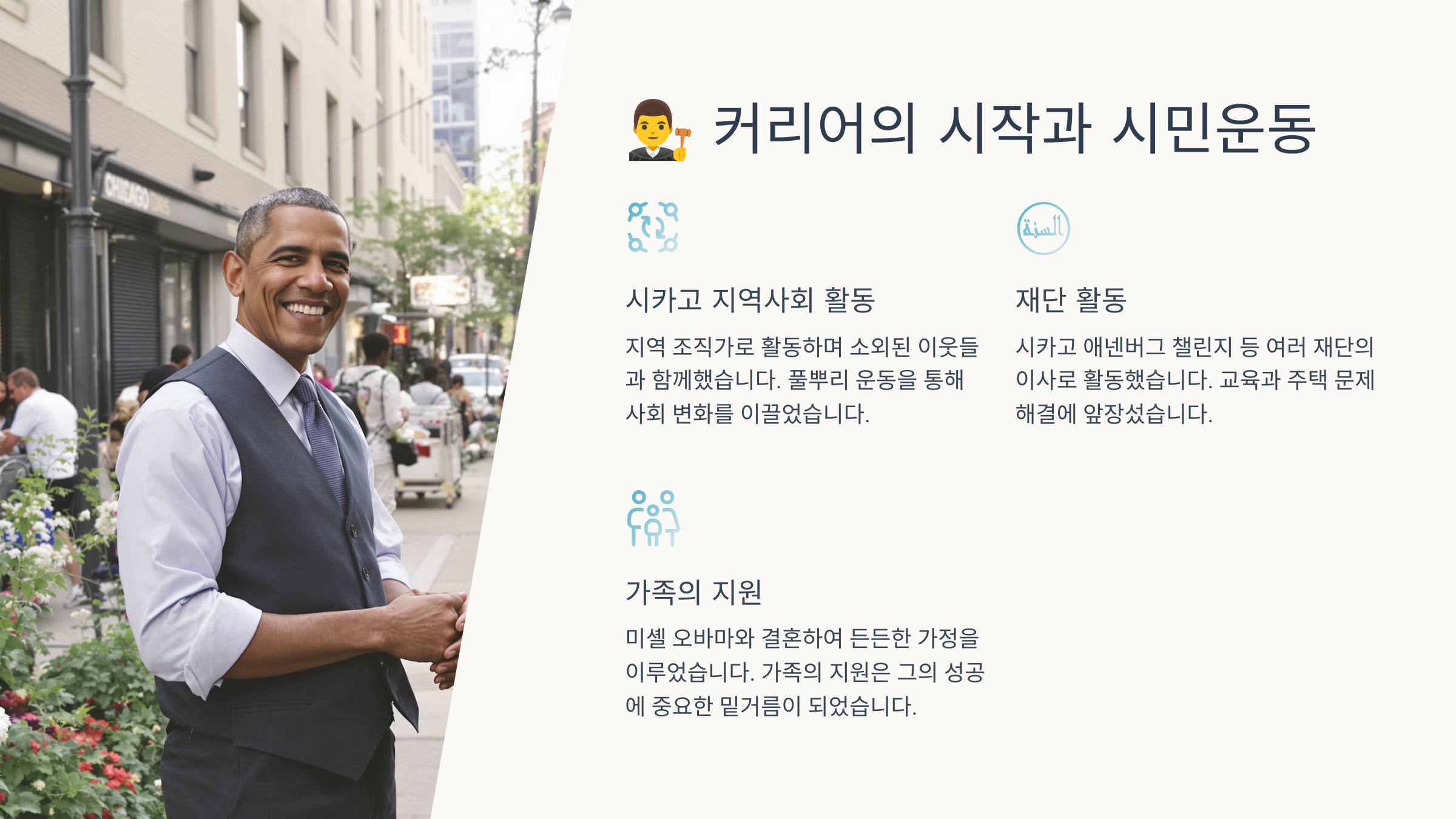 1985년, 오바마는 시카고로 이주해 커뮤니티 오거나이저로 활동하며 도시 빈민가의 주거, 실업, 교육 문제 해결을 위해 주민들과 함께 일했어요. 이 시기의 경험은 그가 '변화는 지역에서부터 시작된다'는 철학을 갖게 만든 결정적 계기였죠.