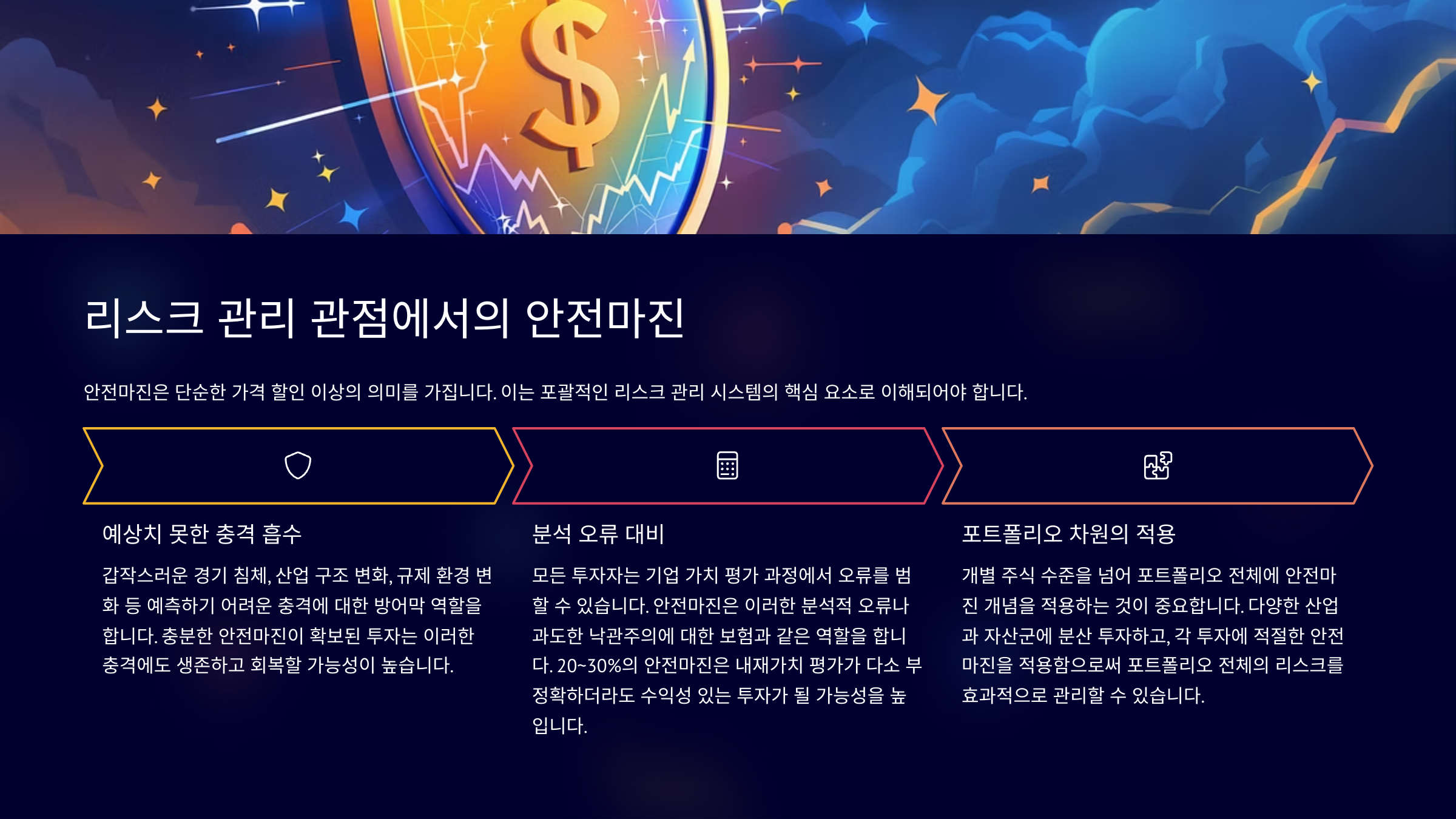 리스크 관리는 단순히 손절가를 정하는 게 아니라, 처음부터 리스크를 줄이는 방향으로 투자 구조를 짜는 것이 핵심이에요. 이때 안전마진은 포트폴리오의 중심 축 역할을 해요.