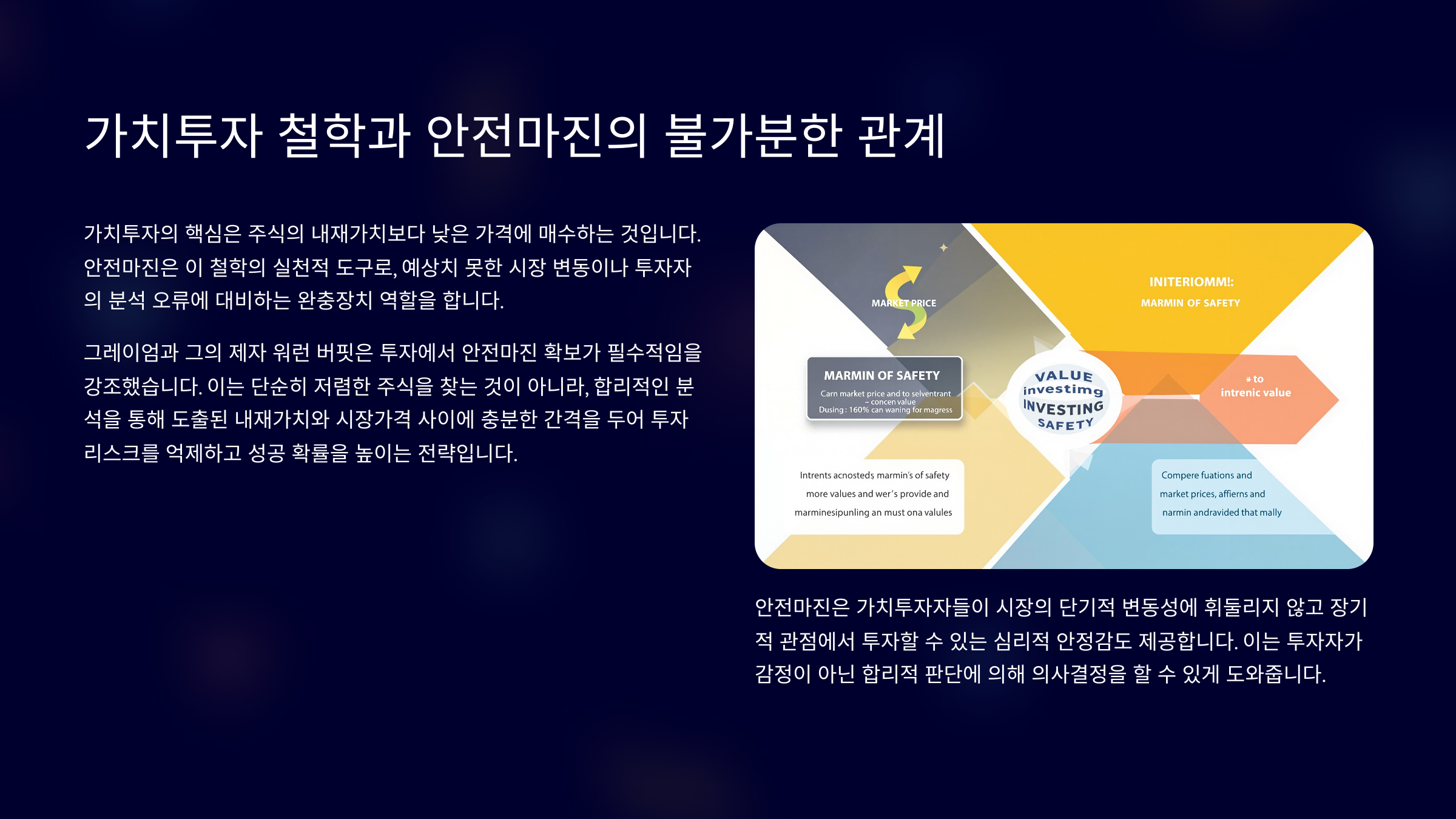 안전마진이란 단순히 싸다는 이유만으로 매수하는 게 아니라, 기업의 본질가치가 변하지 않았거나 오히려 더 견고한데 시장이 과도하게 저평가하고 있을 때 확보되는 개념이에요.